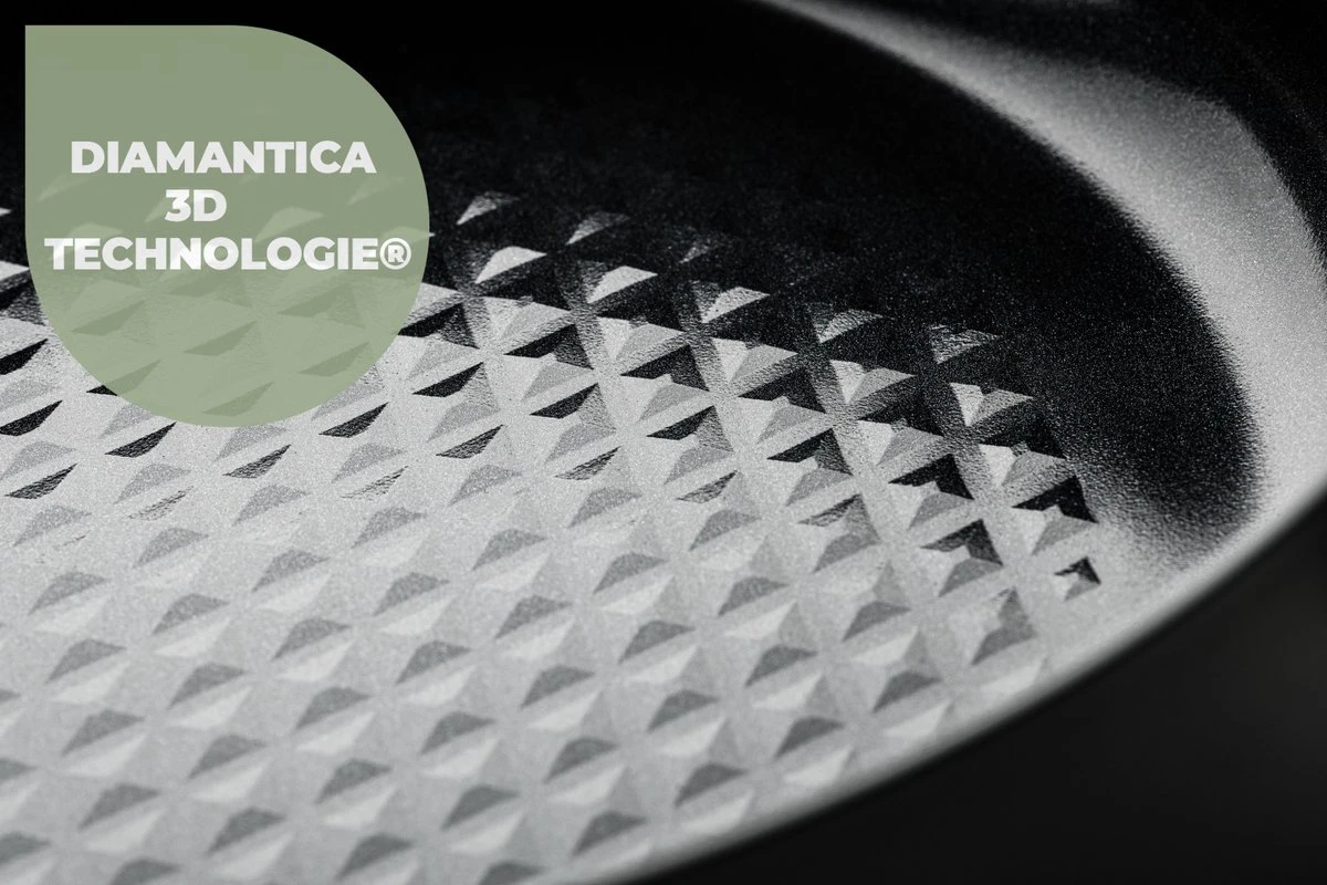 Met het roestvrijstalen handvat heeft deze pan een modern uiterlijk en met de unieke Diamantica 3D technologie heeft u minder olie of boter nodig. Wie zegt dat lekker en gezond niet mooi mag zijn?