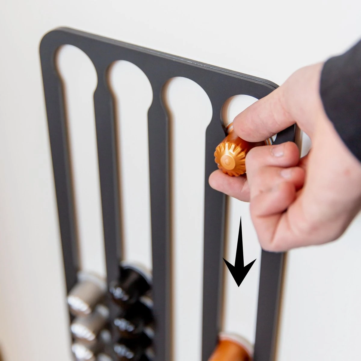 De capsulehouder is gemaakt van mat zwart acrylaat van 3mm dik. Hierdoor heeft de capsulehouder een mooie en luxe uitstraling en contrasteert subtiel met de casules. De afstand houders zijn 3mm hoog zodat de capsules makkelijk in en uit kunnen worden genomen. Daarnaast, een eyecatcher in de keuken!