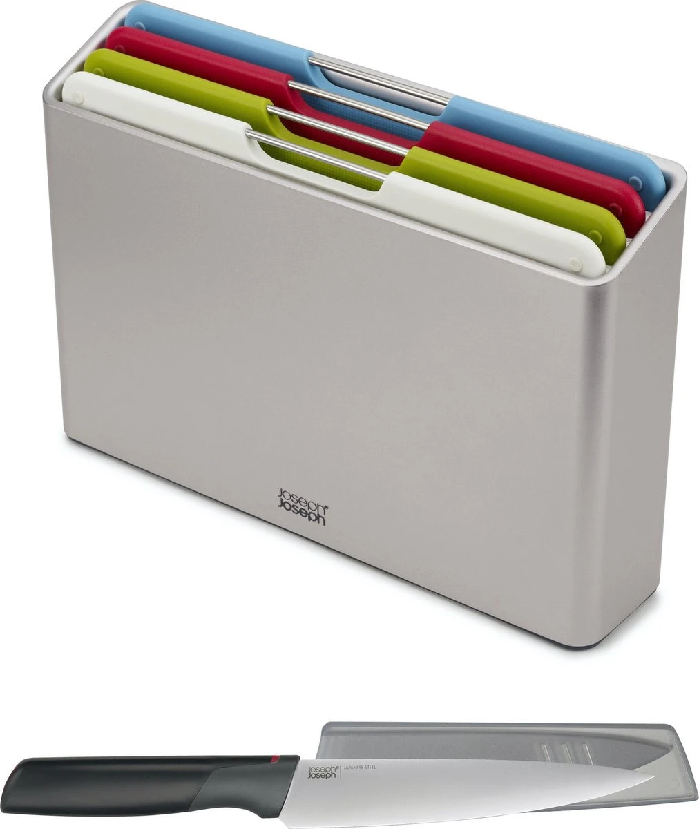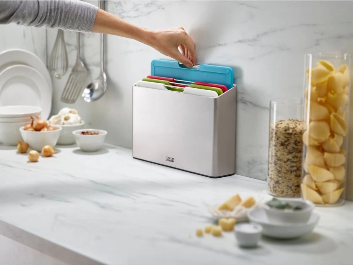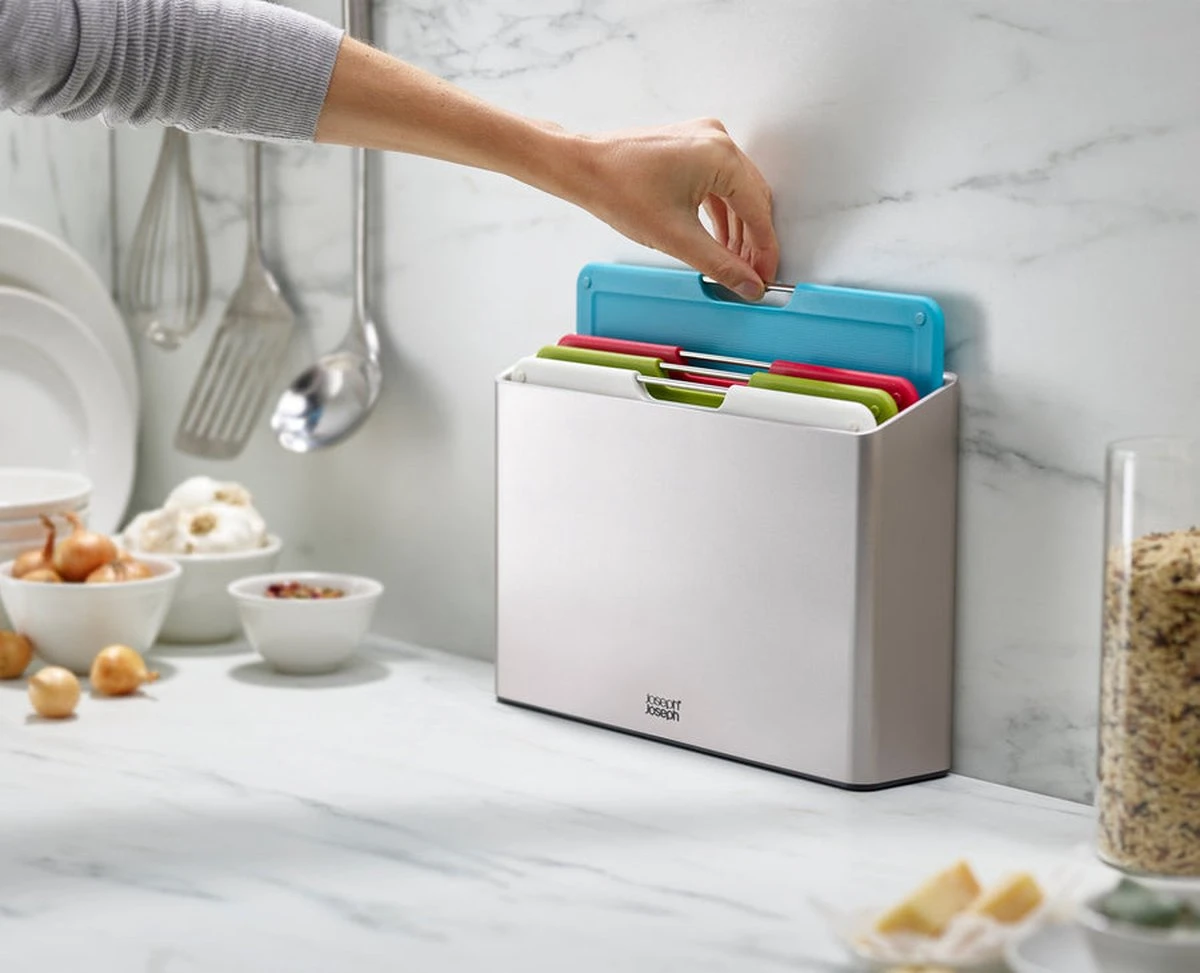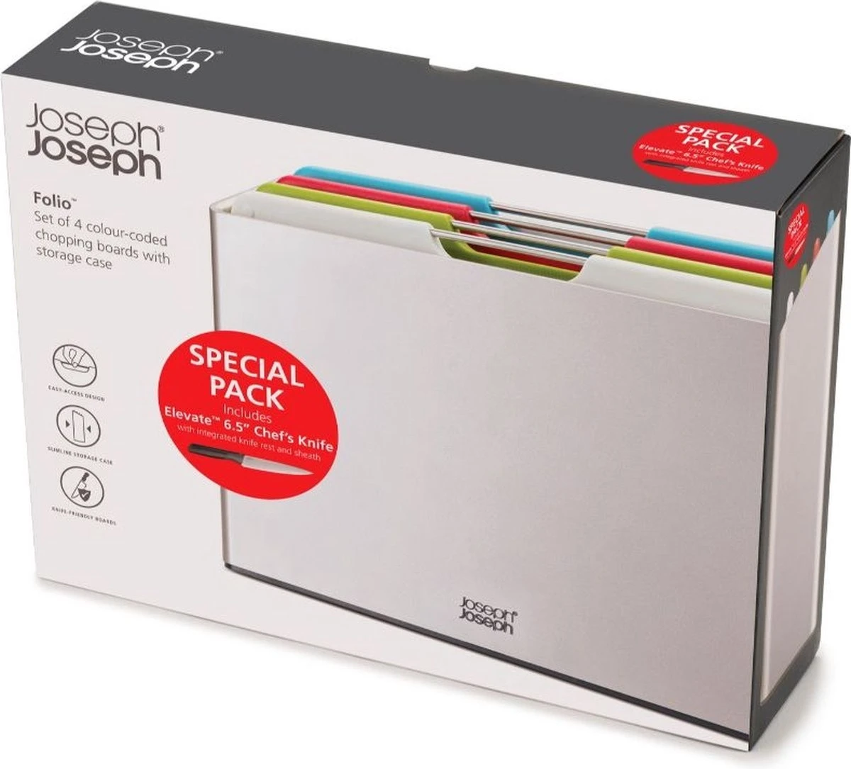 De Folio snijplanken set van Joseph Joseph bestaat uit vier grote snijplanken, een houder en een koksmes. Door vis, vlees, kip, groentes en brood op verschillende snijplanken te snijden voorkom je kruisbesmetting. Elke plank heeft een andere kleur, zodat je ze makkelijk uit elkaar kunt halen. De vier planken hebben een mes vriendelijk, gestructureerd snijoppervlak aan beide zijden. Daarnaast zijn ze BPA-vrij en beschikken ze over antislip voetjes, zodat de snijplank niet zal verschuiven tijdens het snijden van het voedsel. Na gebruik kunnen deze handige hulpmiddelen gewoon in de vaatwasser. Na het schoonspoelen berg je ze makkelijk op in de bijgeleverde houder.