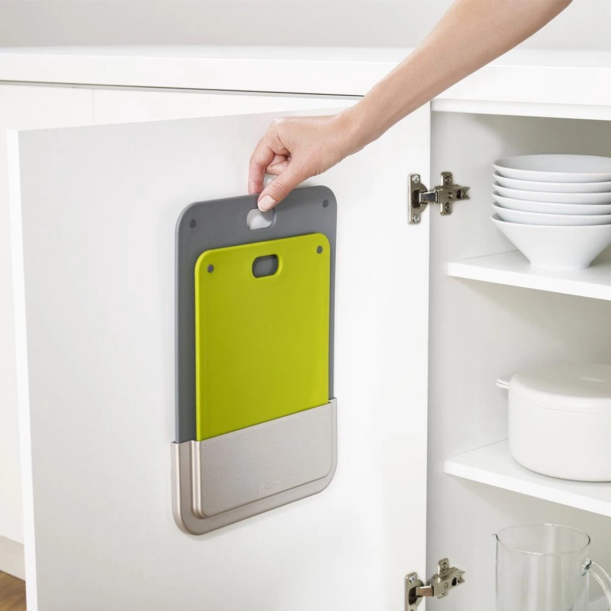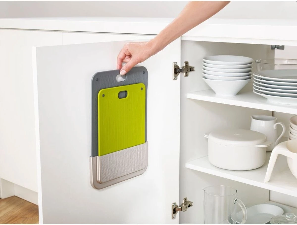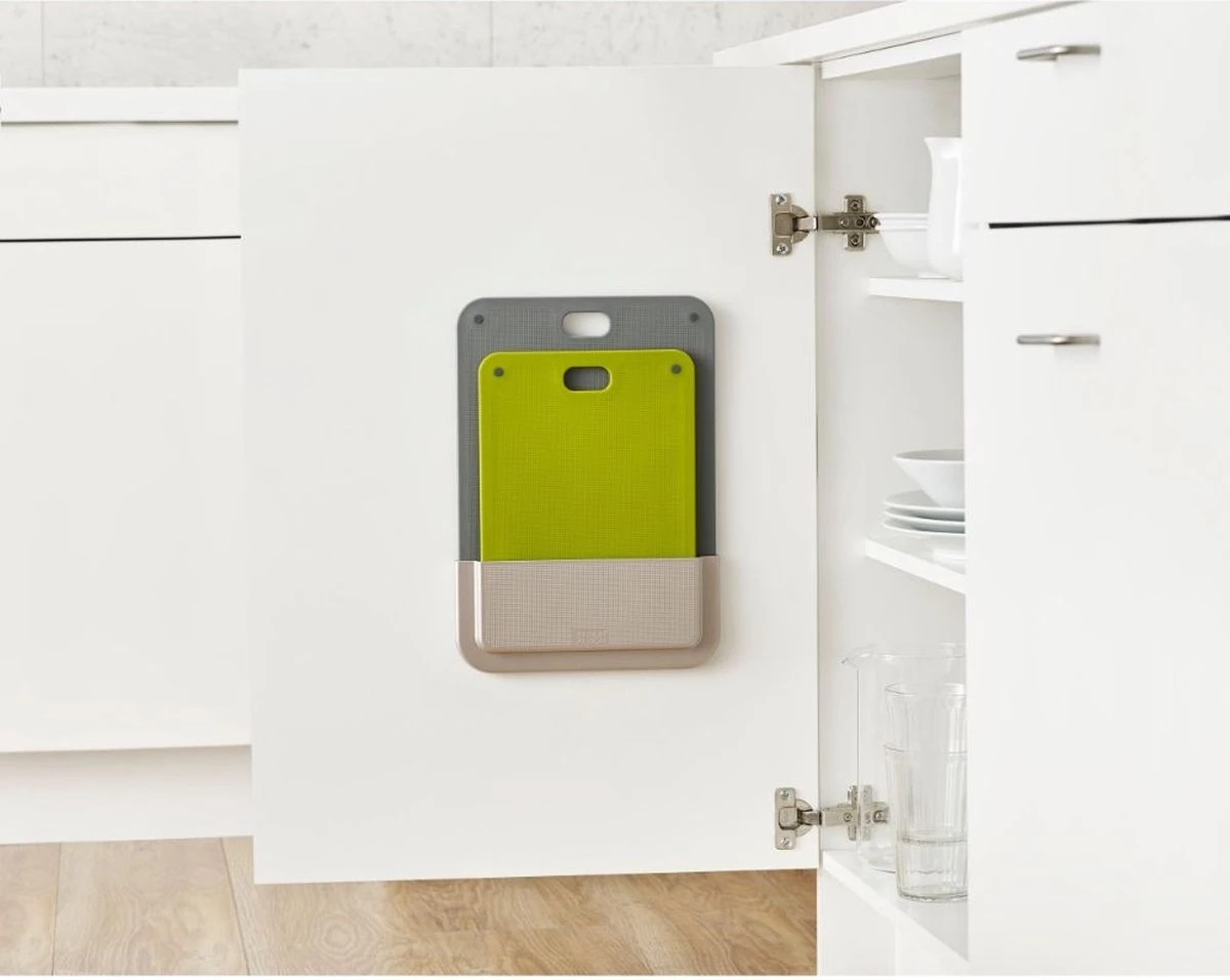 Joseph Joseph staat bekend om haar keukenproducten met mooi en slim design. Deze Joseph Joseph Snijplankenset kun je zonder gereedschap bevestigen aan de binnenkant van je keukenkastje. Hett ophangsysteem wordt uiteraard meegeleverd.
