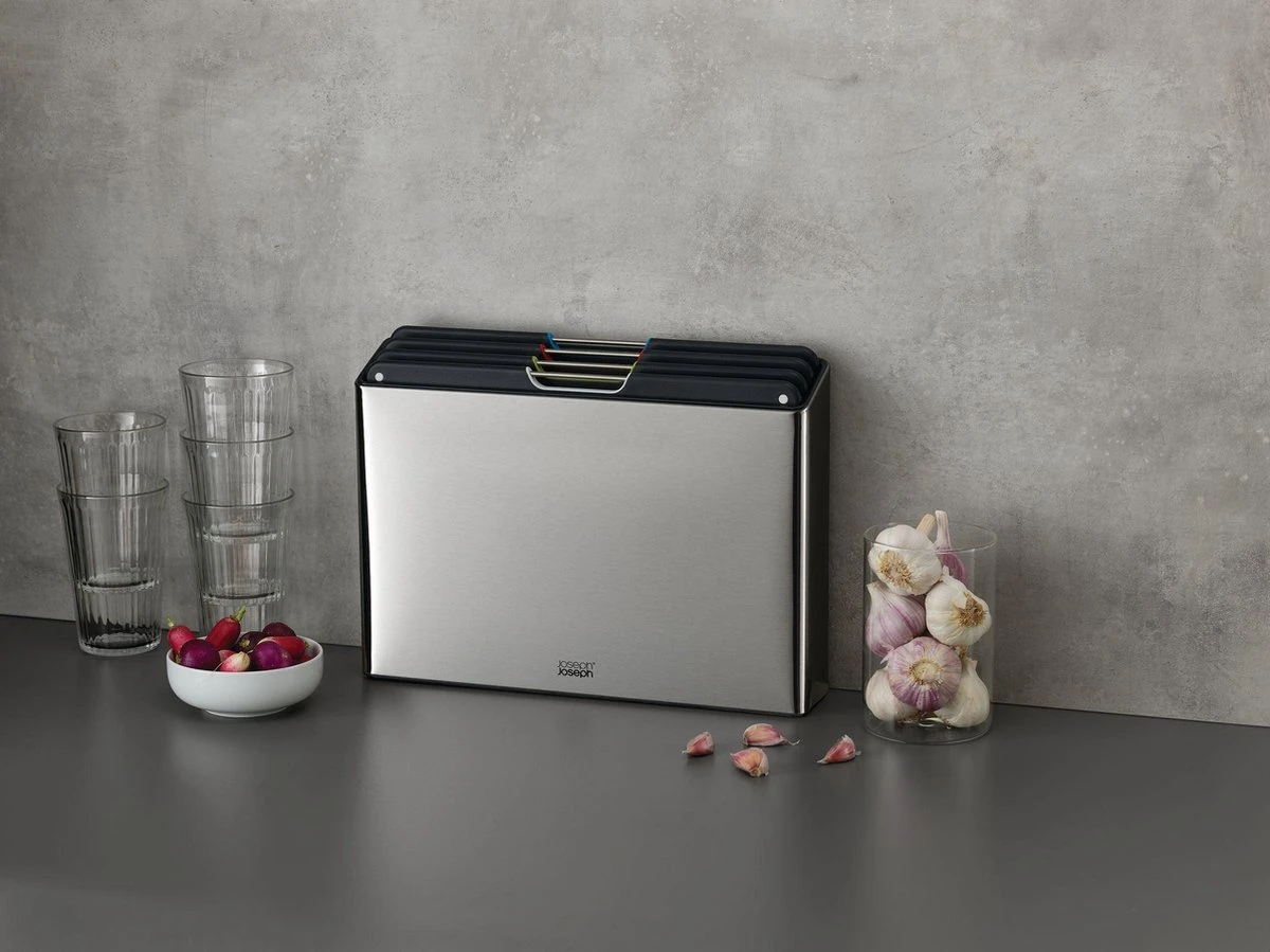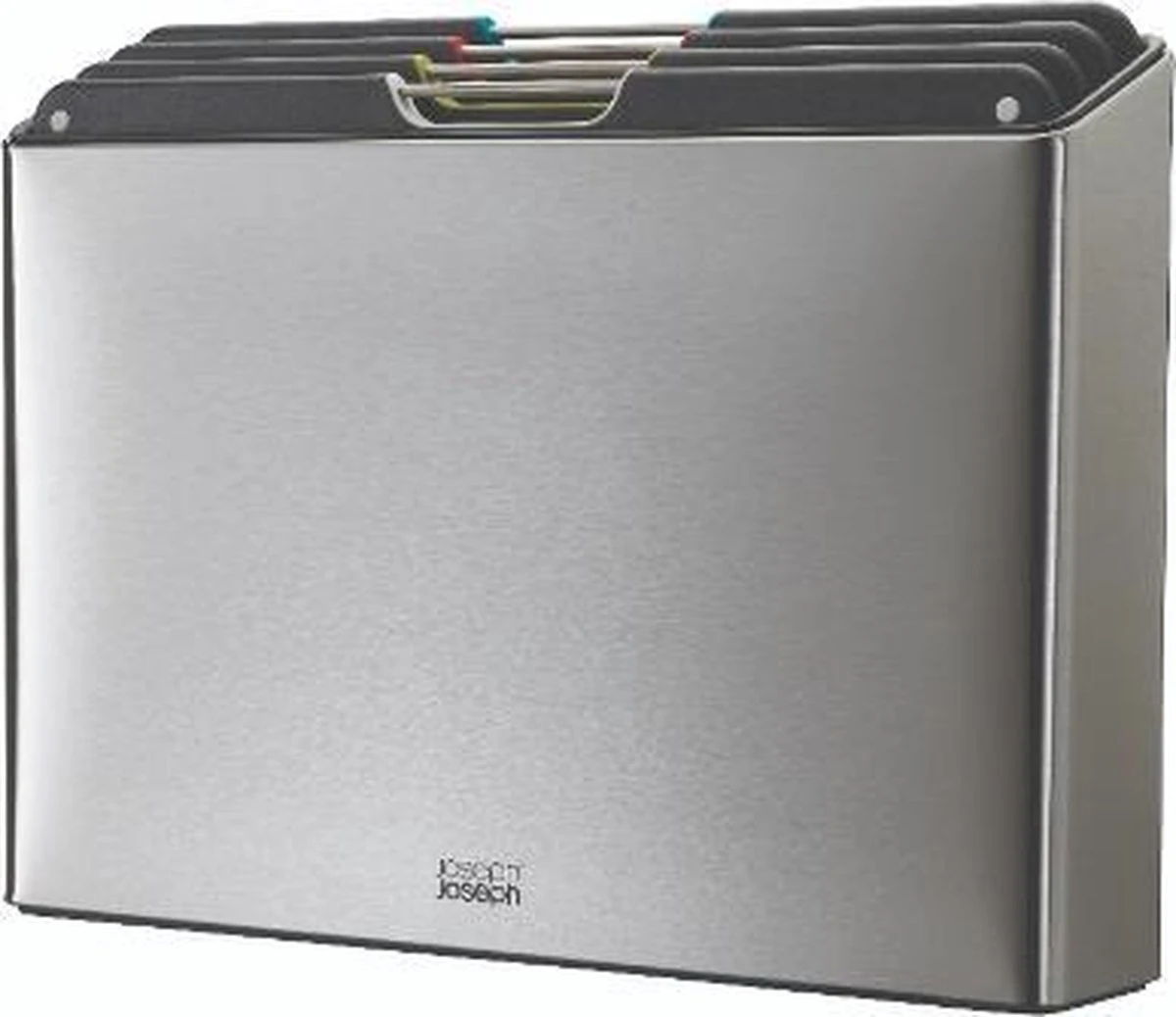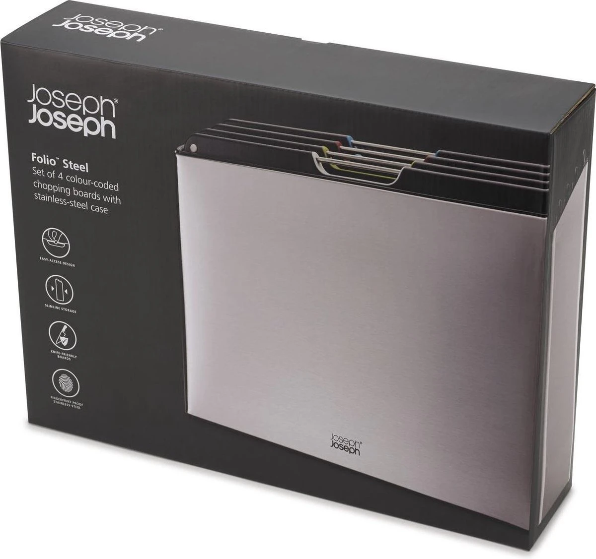 De Folio Steel snijplanken set van Joseph Joseph bestaat uit vier grote snijplanken en een houder. Door vis, vlees, kip, groentes en brood op verschillende snijplanken te snijden voorkom je kruisbesmetting. Elke plank is met een kleur gecodeerd, zodat je ze makkelijk uit elkaar kunt halen. De vier planken hebben een mesvriendelijk, gestructureerd snijoppervlak aan beide zijden. Daarnaast zijn ze BPA-vrij en beschikken ze over antislip voetjes, zodat de snijplank niet zal verschuiven tijdens het snijden van het voedsel. Na gebruik kunnen deze handige hulpmiddelen gewoon in de vaatwasser. Na het schoonspoelen berg je ze makkelijk op in de bijgeleverde houder.