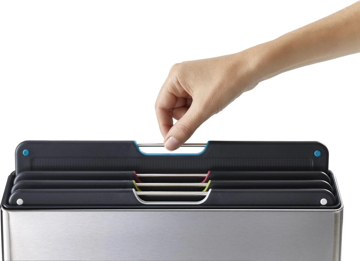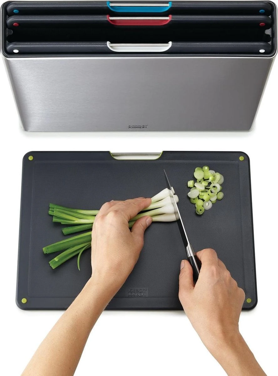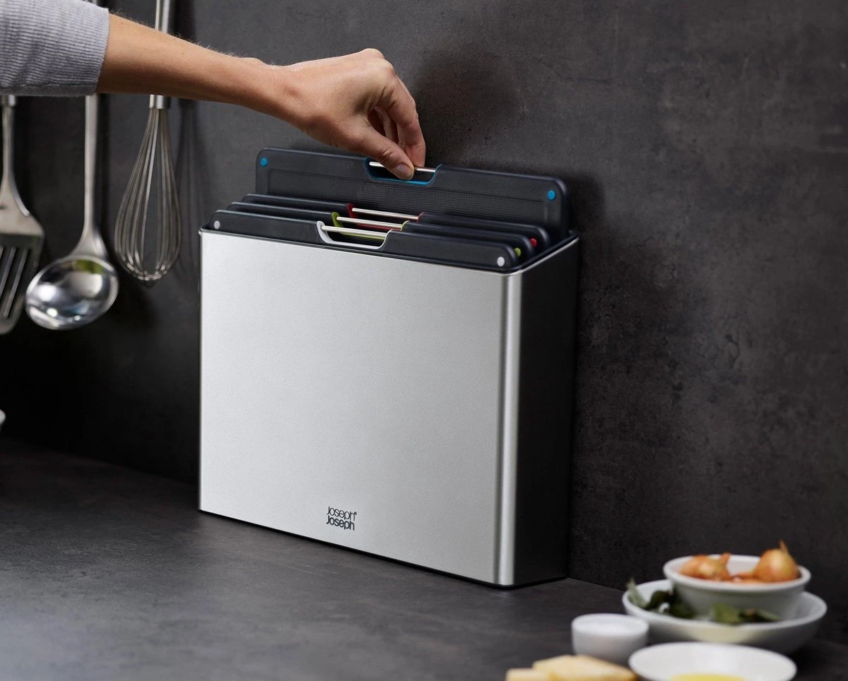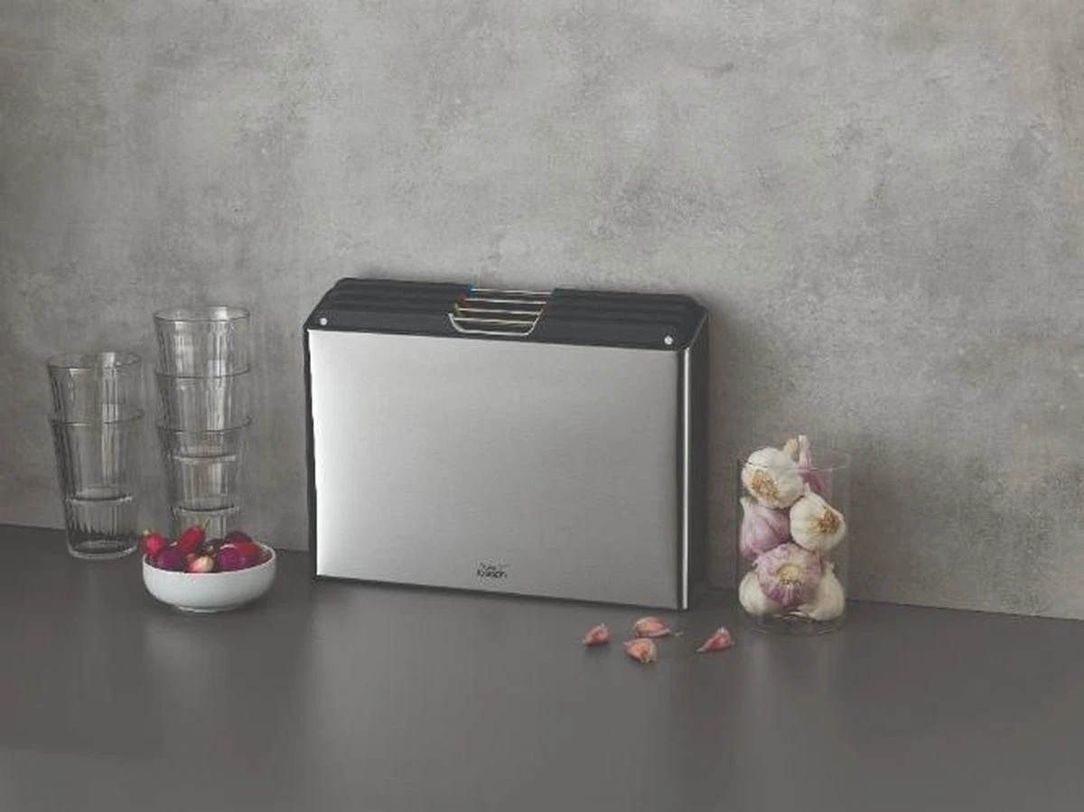De Folio Steel snijplanken set van Joseph Joseph bestaat uit vier grote snijplanken en een houder. Door vis, vlees, kip, groentes en brood op verschillende snijplanken te snijden voorkom je kruisbesmetting. Elke plank is met een kleur gecodeerd, zodat je ze makkelijk uit elkaar kunt halen. De vier planken hebben een mesvriendelijk, gestructureerd snijoppervlak aan beide zijden. Daarnaast zijn ze BPA-vrij en beschikken ze over antislip voetjes, zodat de snijplank niet zal verschuiven tijdens het snijden van het voedsel. Na gebruik kunnen deze handige hulpmiddelen gewoon in de vaatwasser. Na het schoonspoelen berg je ze makkelijk op in de bijgeleverde houder.