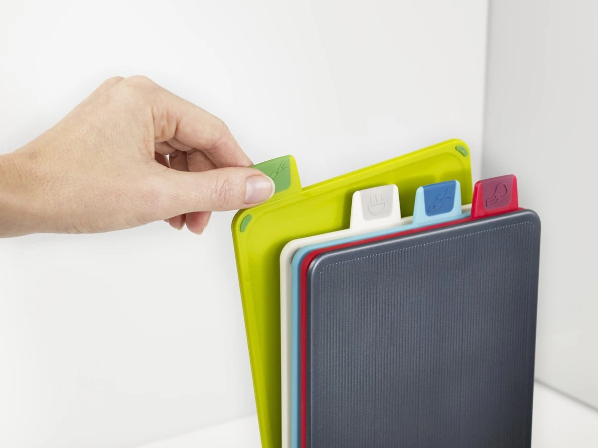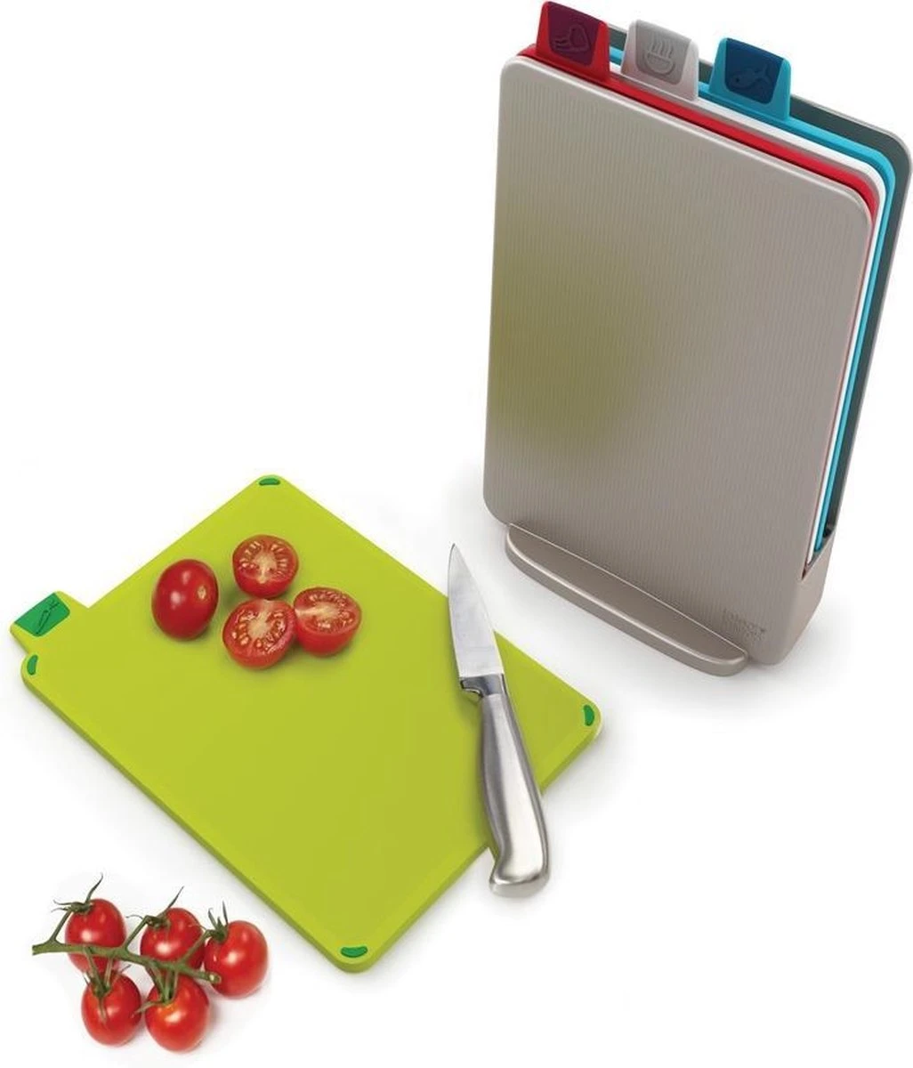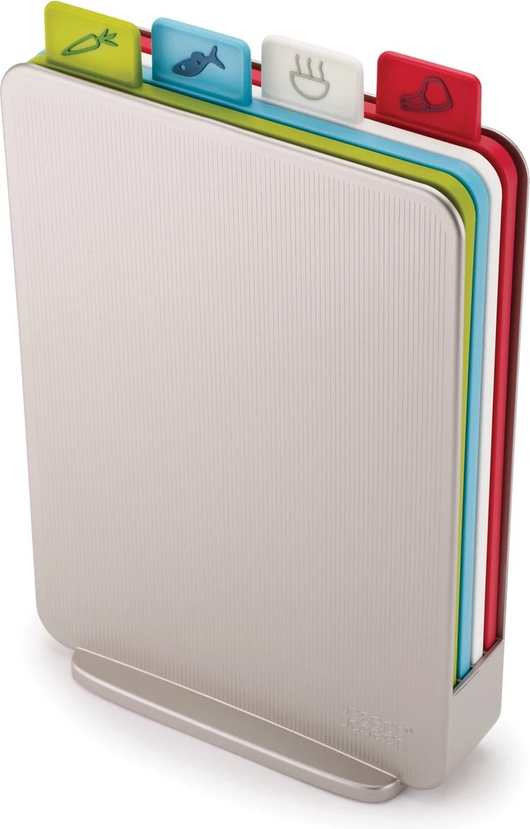 De snijplanken uit de “INDEX “ serie van Joseph Joseph onderscheiden zich omdat de kleuren van de snijplanken overeen komen met de hygiëne codes. Door vis, vlees, kip, groentes en brood op verschillende snijplanken te snijden voorkom je kruisbesmetting. De snijplanken hebben antislip voetjes en kunnen in de vaatwasser. De Index Joseph Joseph met 4 snijplanken worden in een houder geleverd. De Index snijplanken zijn een sierraad voor uw keukenblad. De snijplanken zijn BPA vrij en vaatwasmachinebestendig.