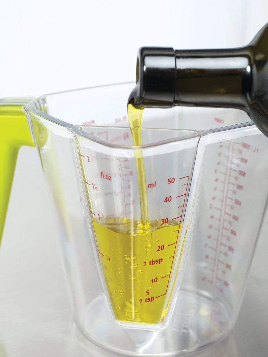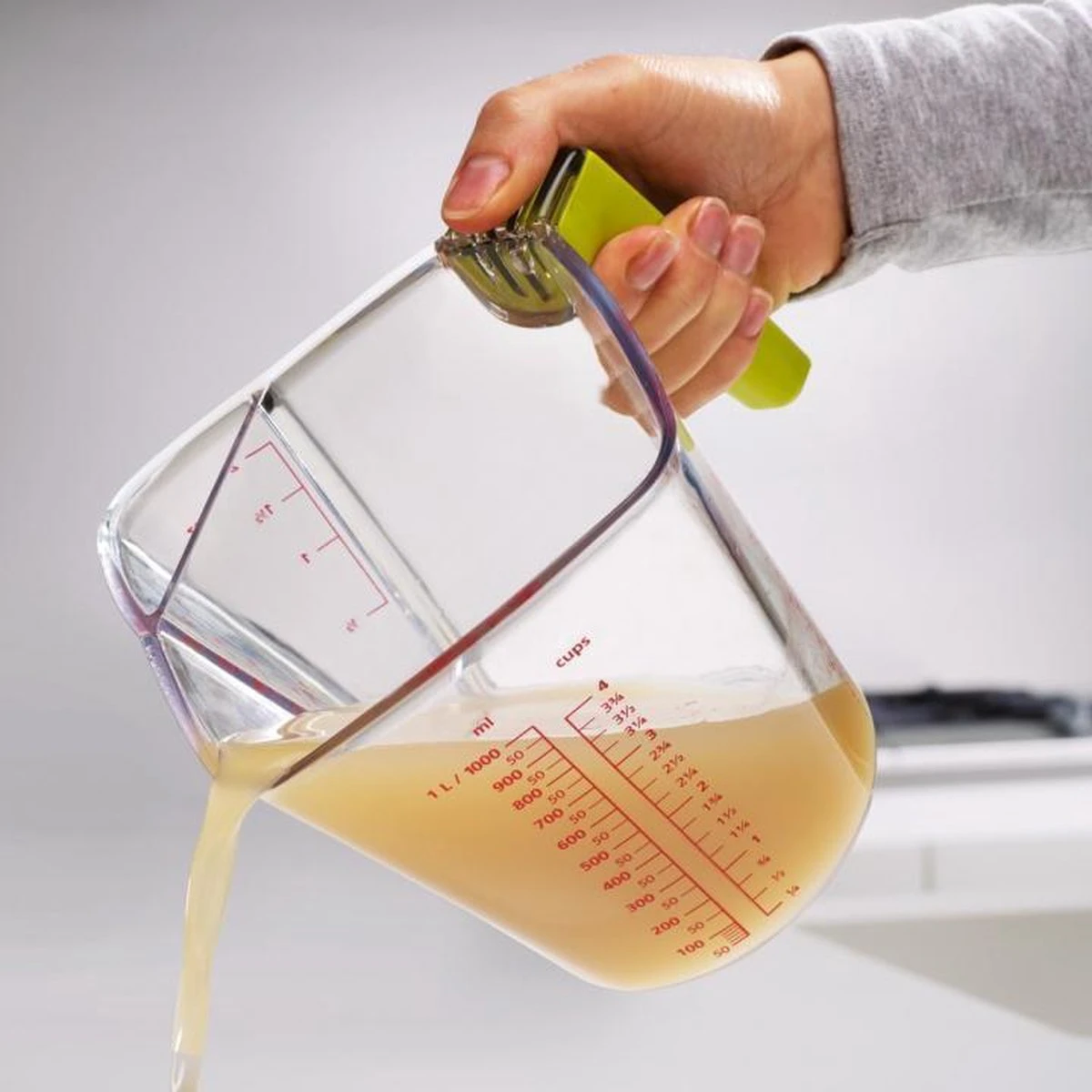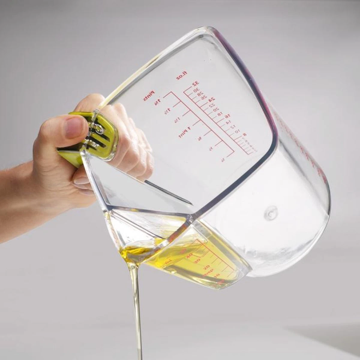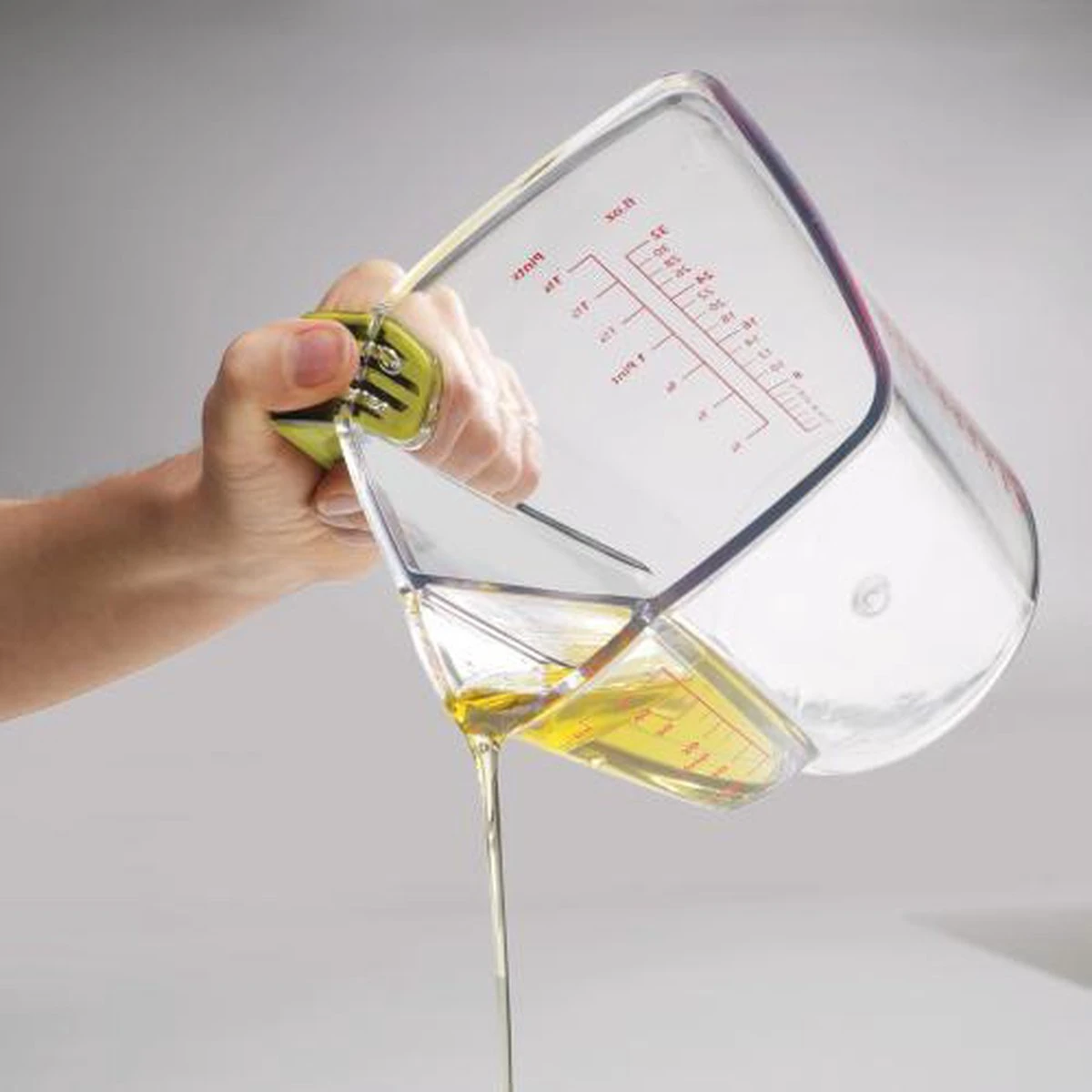 De maatbeker heeft een prettig soft-grip-handvat. Schenken gaat zonder morsen door de handige hoeken.