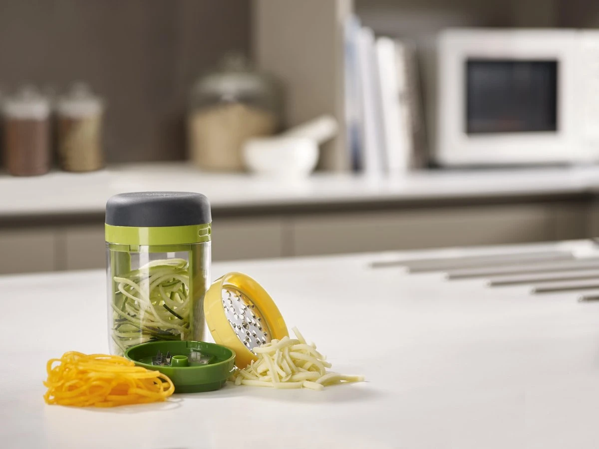 Geen rommel meer op het aanrecht! De Spiro is zo ontworpen dat de opbergbox een opvangbak is tijdens het raspen. De set bestaat uit 2 verschillende spiraalsnijbladen en 1 rasp. De Spriro is eenvoudig te bedienen door het antislip deksel en de twee geleiders. Alle onderdelen mogen in de vaatwasser.