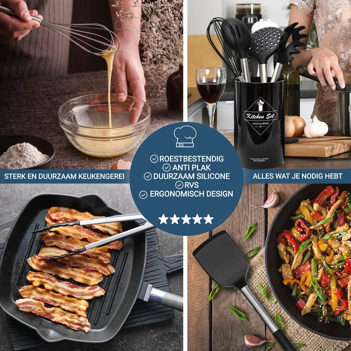 Omdat wij een set leveren met wel 13 verschillende kookgerei ben jij helemaal klaar voor alle gerechten uit alle keukens. Met de spatel, tang, schuimspaan en griltang maak jij van elke gerecht een culinair moment. Daarnaast ontvang jij ook een houder, waardoor jij alle spatels, tangen en kookgerei kan opbergen in de bijbehorende houder.
