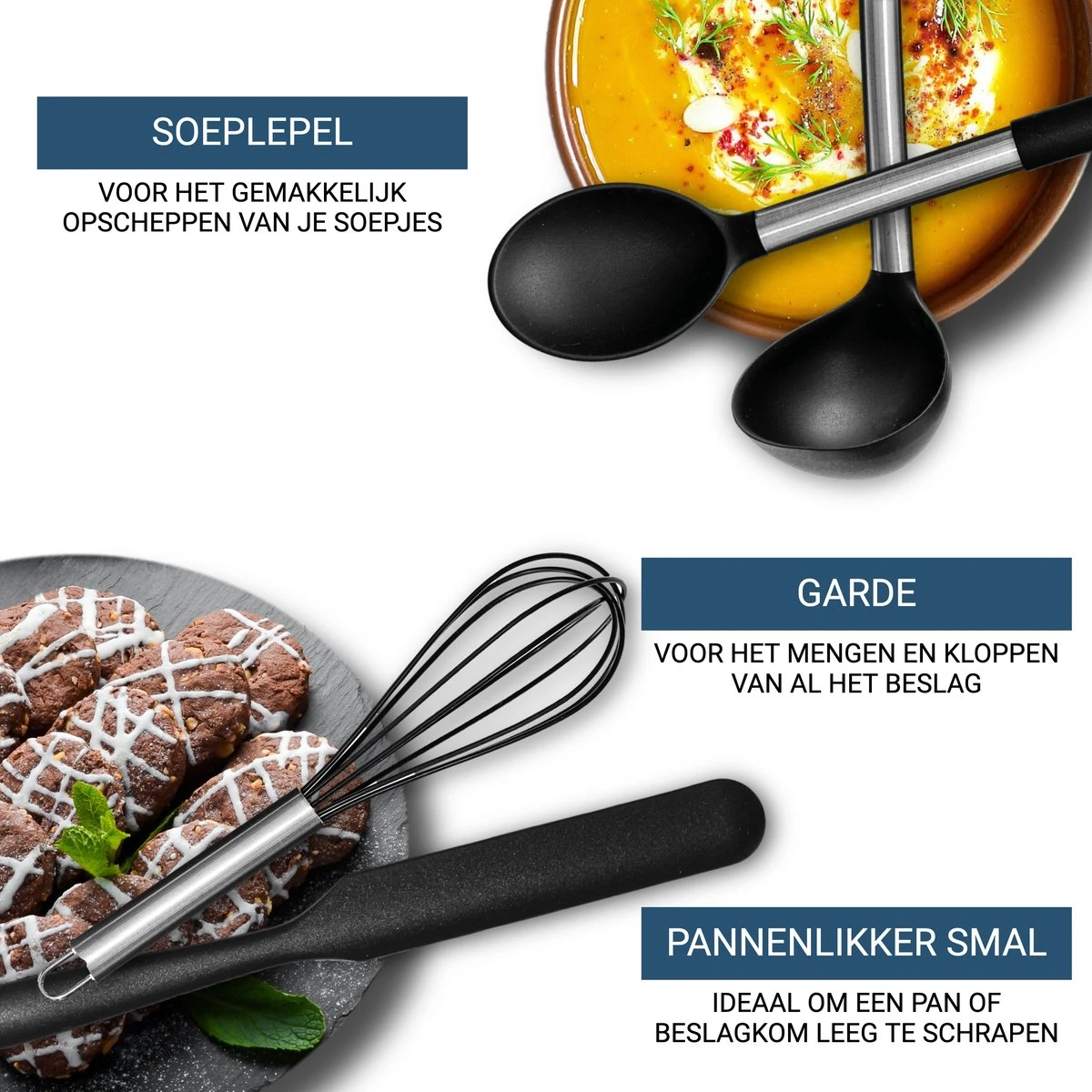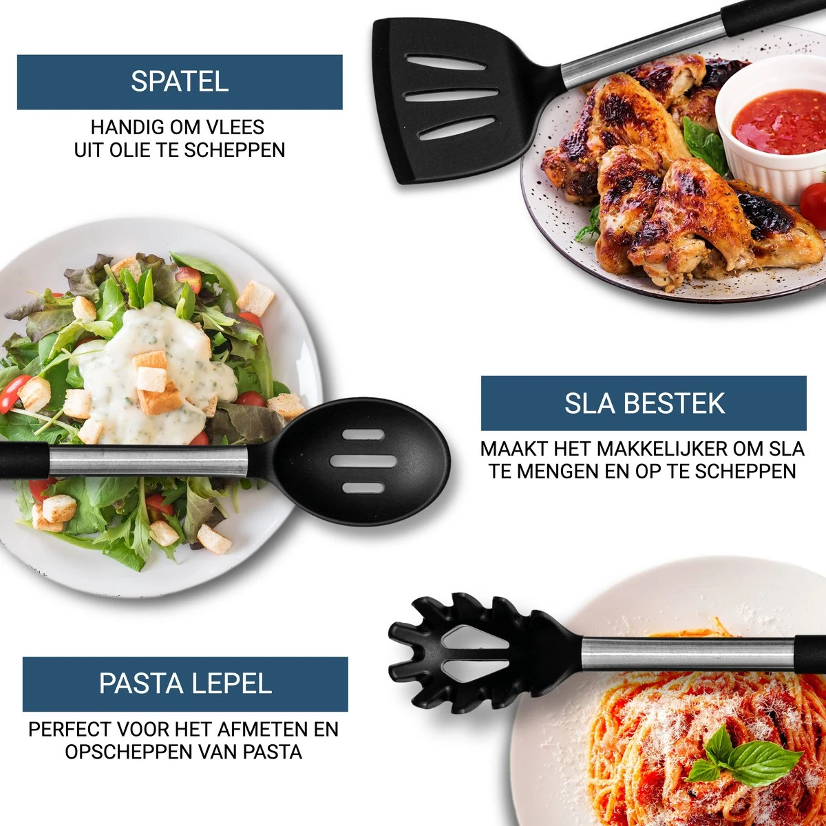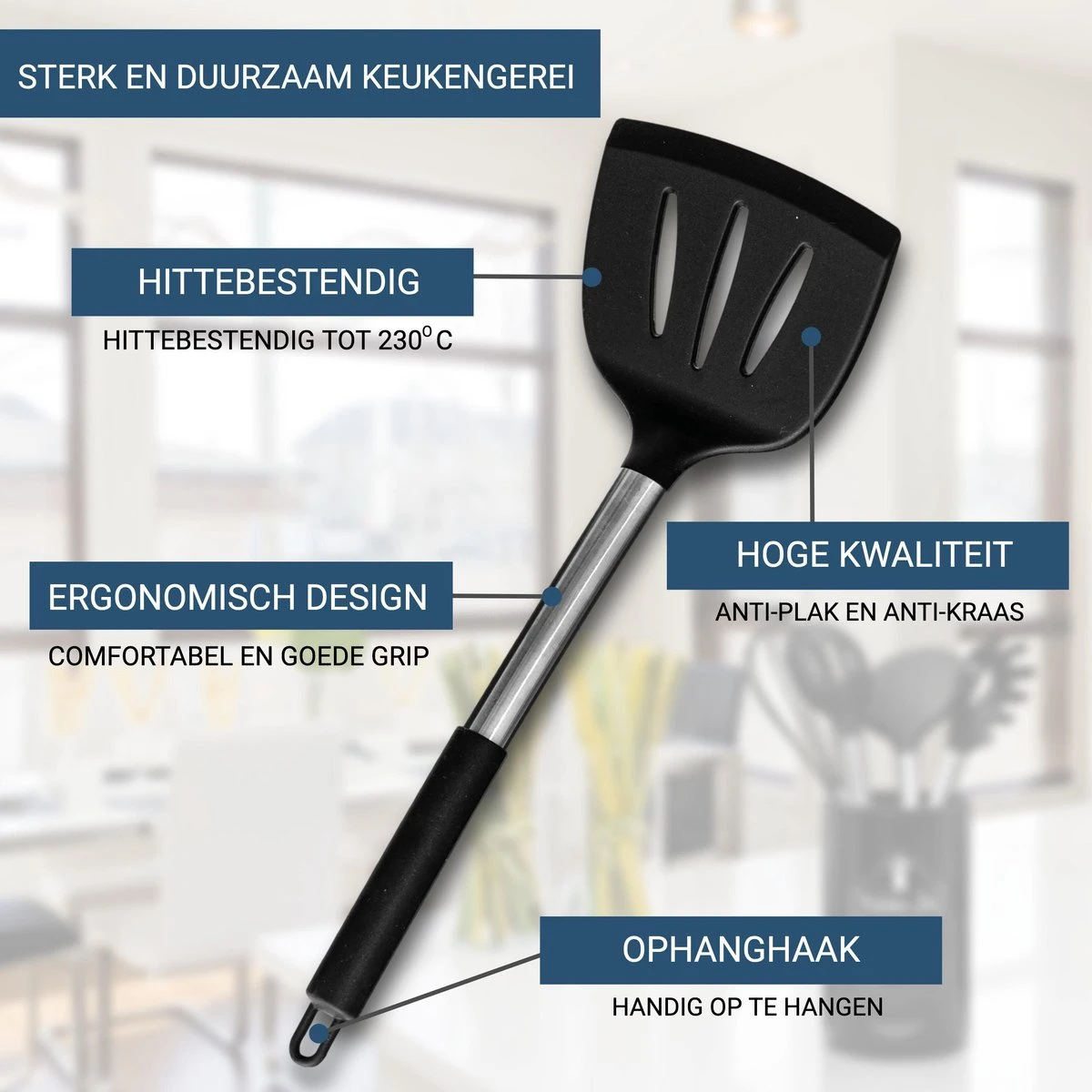 De keukengerei set is zeer geschikt voor pannen met anti aanbak laag. Het kookgerei is hittebestendig tot 250 graden Celsius en heeft een antiplak functie, waardoor jouw eten niet aan het kookgerei blijft plakken. Hierdoor wordt het opscheppen van eten een stuk makkelijker. De gehele set is ophangbaar en ook makkelijk op te bergen in een keukenla of kast. Onze kookgerei set is BPA-, Latex- en Plasticvrij, waardoor dit kookgerei geen schadelijke effecten heeft op jouw gezondheid.