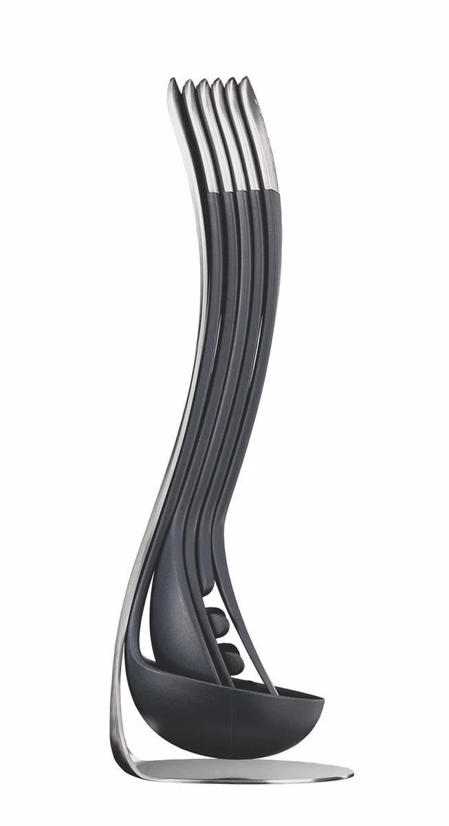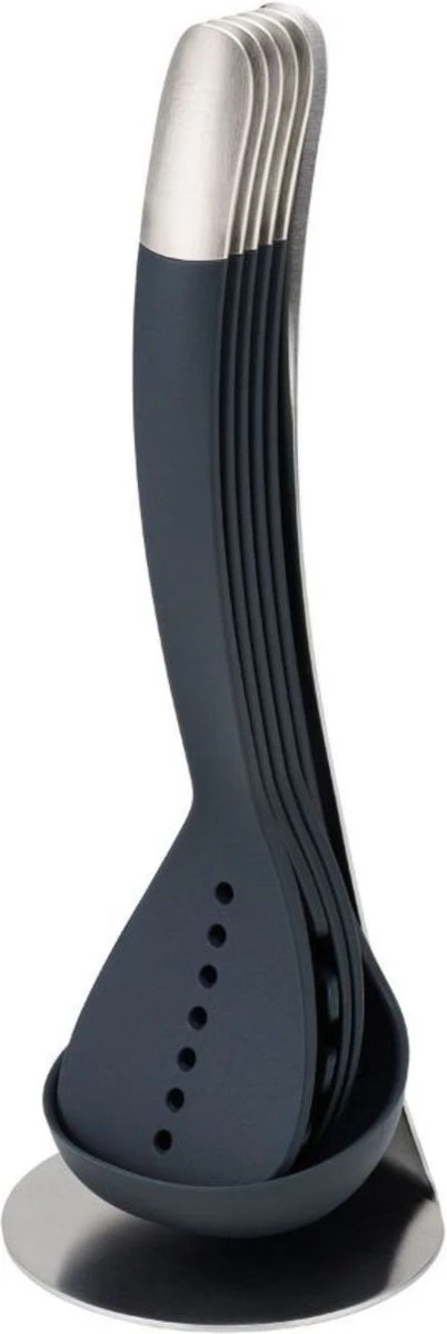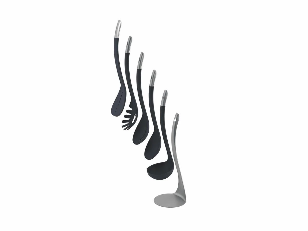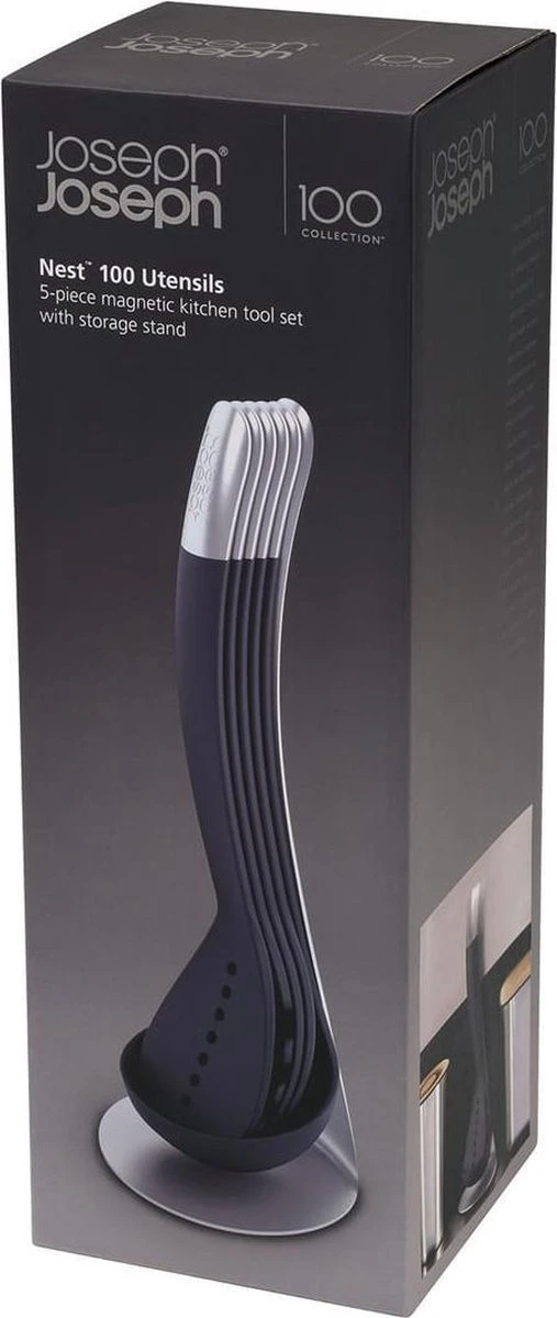 De keukenhulp set van Joseph Joseph is praktisch én ruimtebesparend dankzij haar magnetische houder. Deze stijlvolle set bestaat uit een soeplepel, een opscheplepel, een spaghettilepel, een opscheplepel met gaatjes en een spatel. Alle keukenhulpjes kunnen eenvoudig door middel van de magnetische handgrepen aan elkaar bevestigd worden waarna de magnetische houder ze compact bij elkaar houdt. Dankzij het BPA vrije siliconen kunnen alle keukenhulpjes veilig gebruikt worden in pannen met anti-aanbaklaag. Verder zijn de spatels en lepels hittebestendig tot 200 °C en daarnaast vaatwasserbestendig. Het is aan te raden om het keukengerei niet in de pan te laten zitten tijdens het koken.