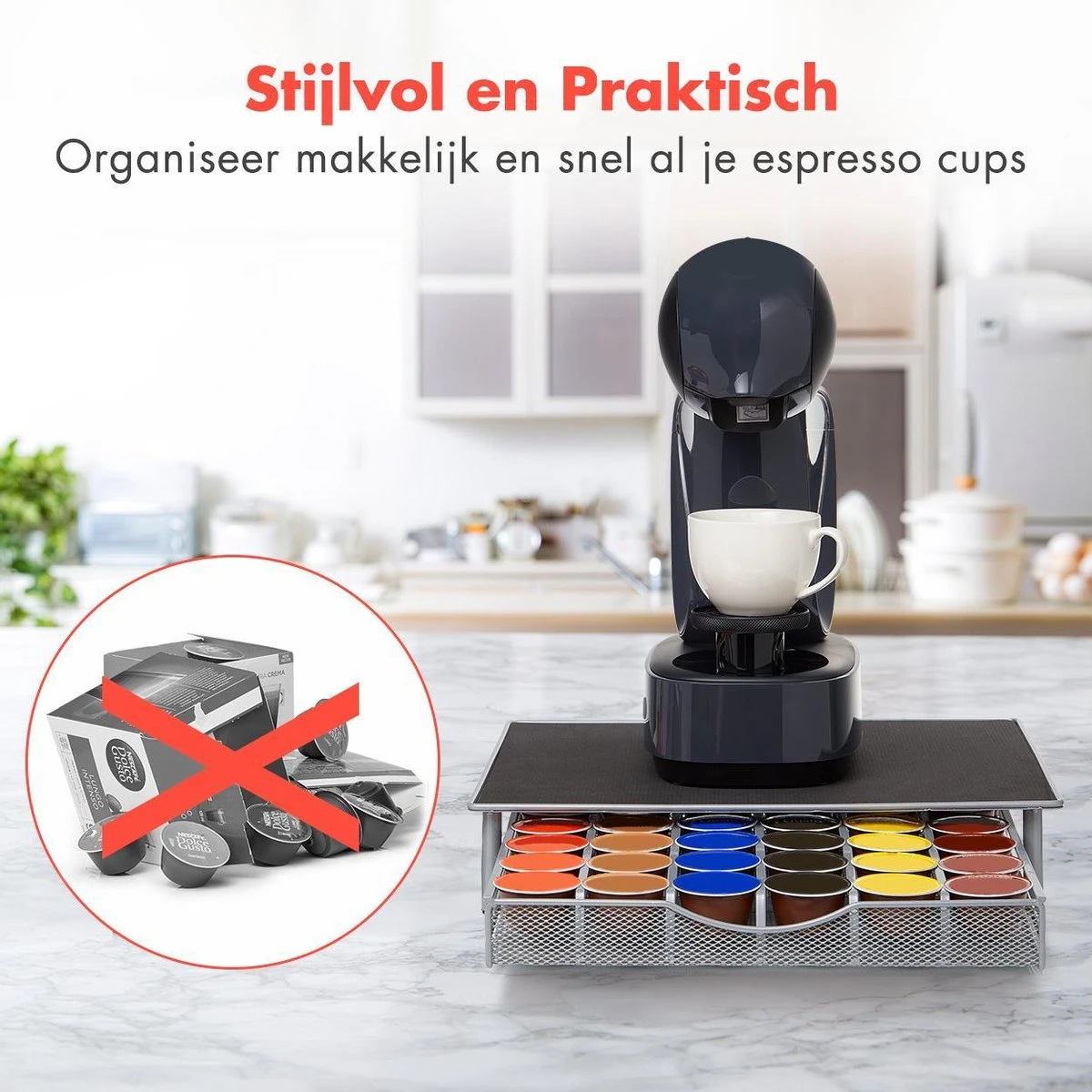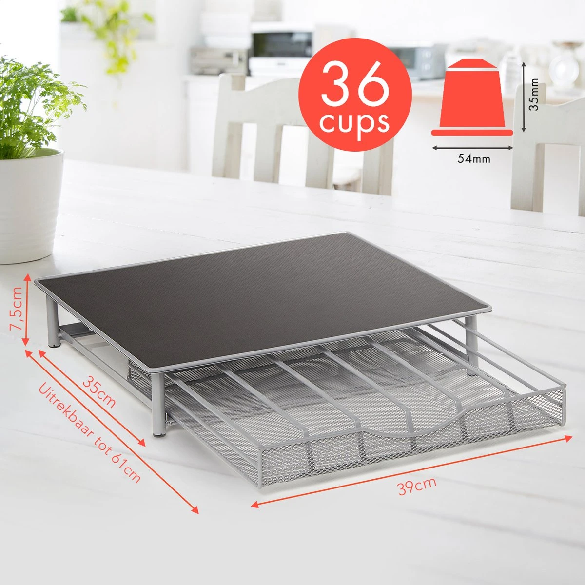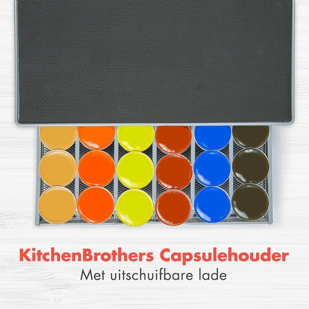 Creëer een opgeruimde keuken en een handig overzicht van al je lievelings koffiesmaken met deze KitchenBrothers capsulehouder! De capsulehouder heeft een lade met ruimte voor 36 koffiecapsules en is voorzien van antislip- en anti-vibratie materiaal aan de bovenzijde en biedt de mogelijkheid om bijvoorbeeld je koffiezetapparaat of je koffiekopjes op de houder te plaatsen.