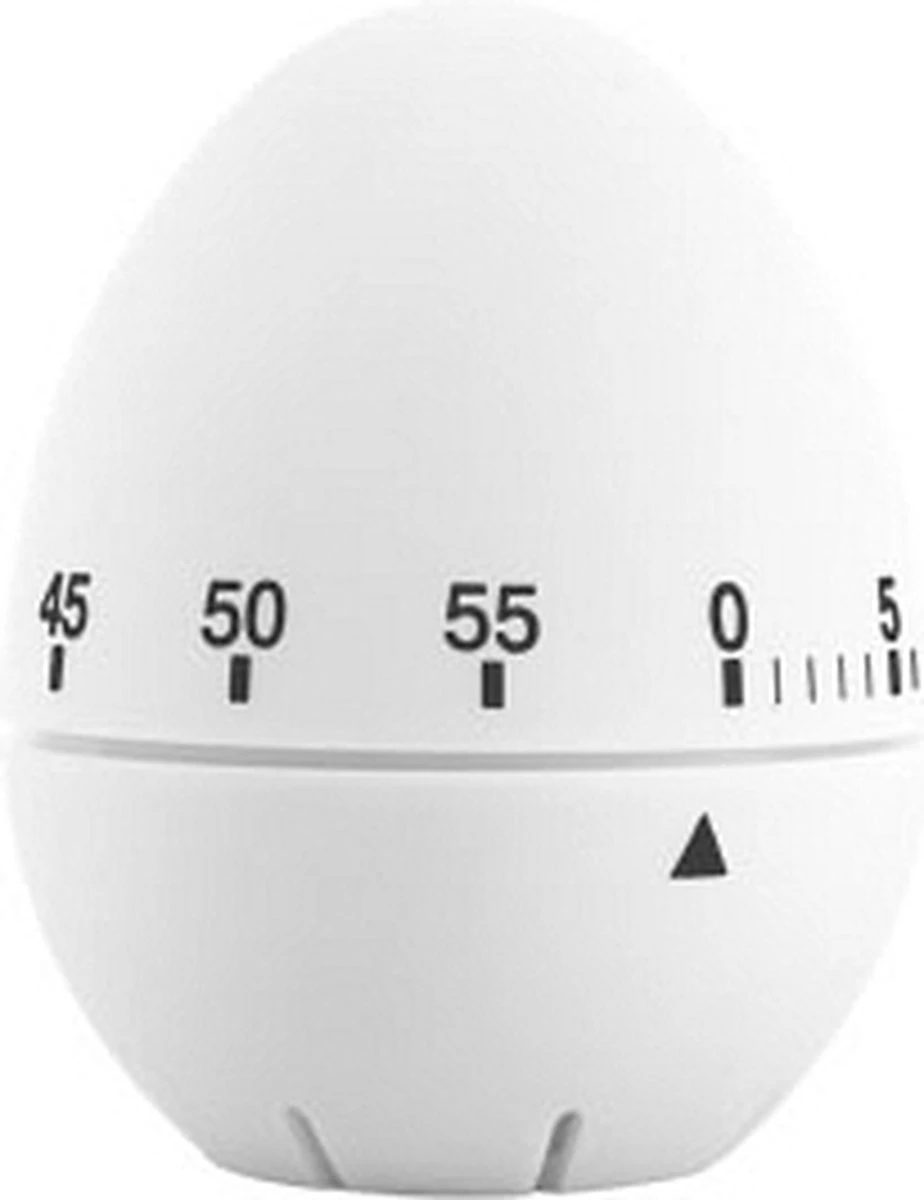 Kookwekker in de vorm van een ei. De wekker is analoog en een uur te programmeren. Afmeting is circa 6 x 8 cm.
