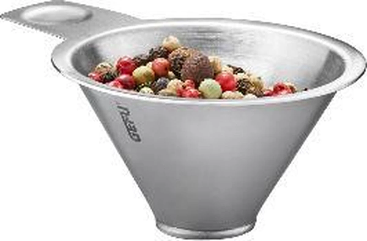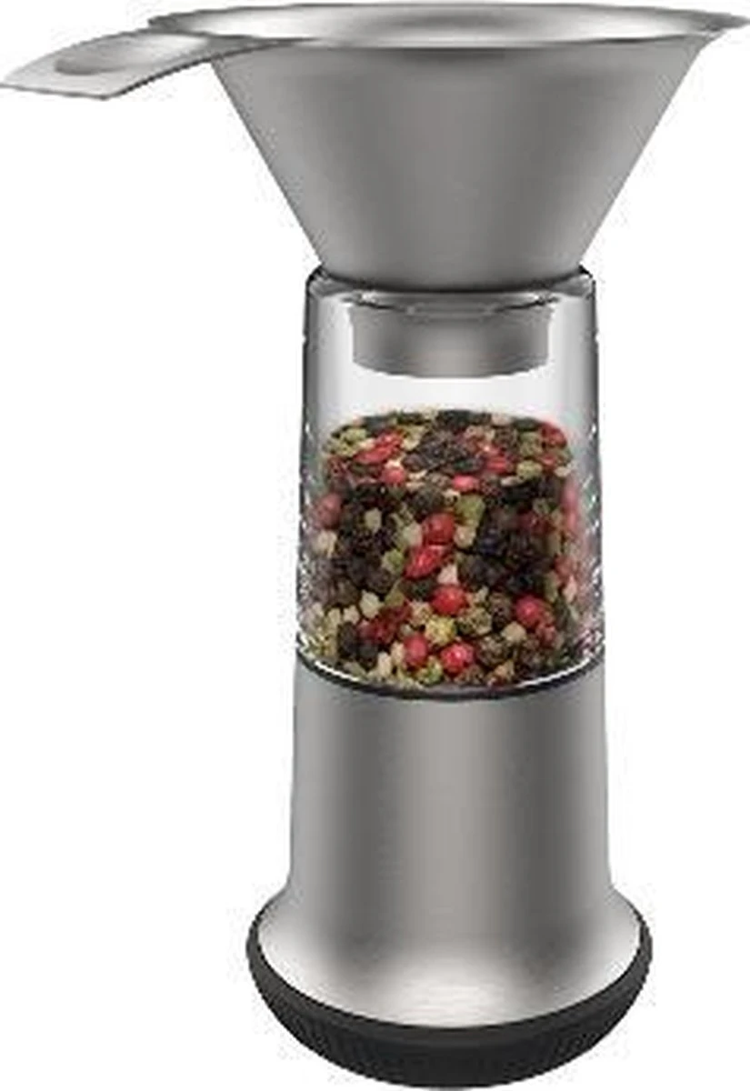 Zout en pepermolens of kruidenpotjes bijvullen zonder te knoeien is normaal gesproken een flinke uitdaging. Deze eenvoudige, veelzijdige en slimme kruiden trechter maakt het bijvullen ineens een stuk eenvoudiger. Daarnaast kun je hem met het handige duimstukje gemakkelijk beethouden en verplaatsen. De trechter is gemaakt van RVS en heeft een afmeting van 9,8 cm x 7,2 cm x 4 cm. Na gebruik kan hij gereinigd worden in de vaatwasser.