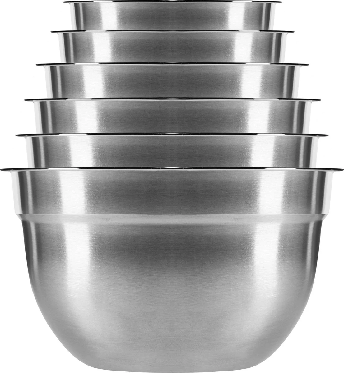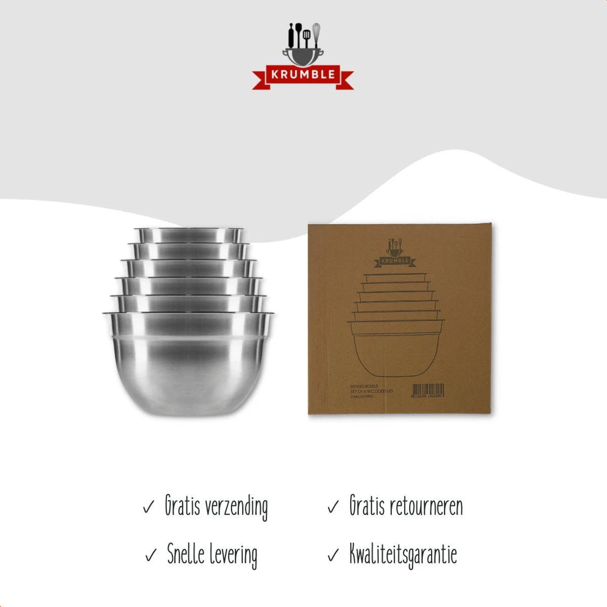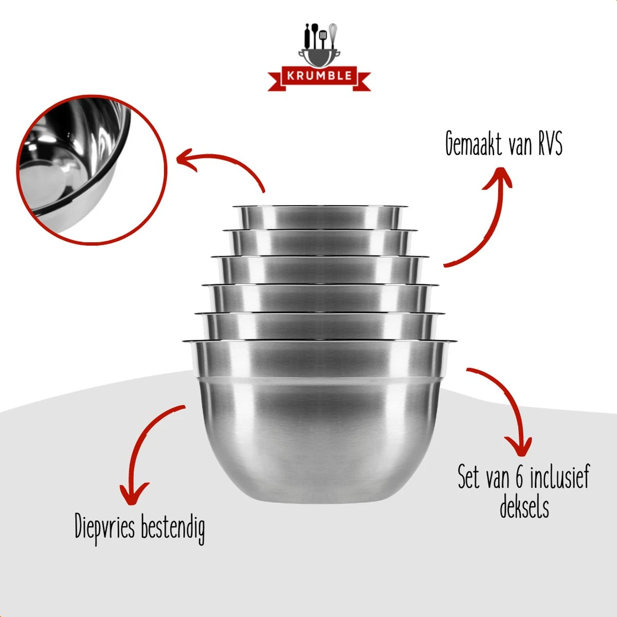 Deze mengschalen zijn gemaakt van RVS. Hierdoor zijn de komen geschikt voor het bereiden van tal van gerechten. Zo kun je ook uitstekend eiwit scheiden van eidooiers en deze kloppen tot een luchtig geheel. Dit maakt deze beslagkom ook erg geliefd om mee te bakken en dankzij de set van zes, is er voor iedere creatie een passende kom te gebruiken. Deze kommen zijn geschikt voor de vaatwasser. De deksels zijn dat niet. Na langdurig gebruik zijn de kommen nog steeds van uitstekende kwaliteit. Vul je bakgerei verder aan en kies voor deze ijzersterke set van Krumble.