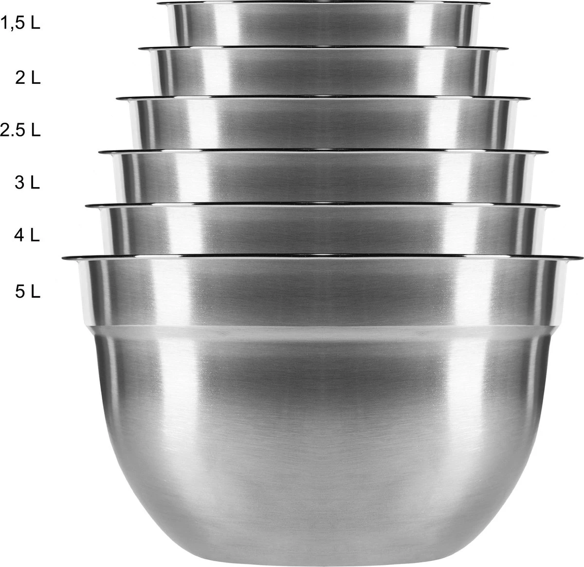 Een mengkom is een echte must voor in iedere keuken. Het is dé tool waarmee je een salade klaar kunt maken, makkelijk stokbrood in kunt serveren of afval in kunt scheiden. Daarom doet het je goed om te investeren in kwalitatief goed materieel, zoals de Krumble Mengkommen. Door het hoogwaardige RVS zijn de kommen makkelijk schoon te maken en door de verschillende afmetingen zijn de kommen makkelijk op te bergen door ze in elkaar te leggen. De inhoud van de kommen is als volgt: 1.5L, 2L, 2.5L, 3L, 4L en 5L. Maak het koken net even wat leuker en makkelijker door deze handige set in huis te halen.