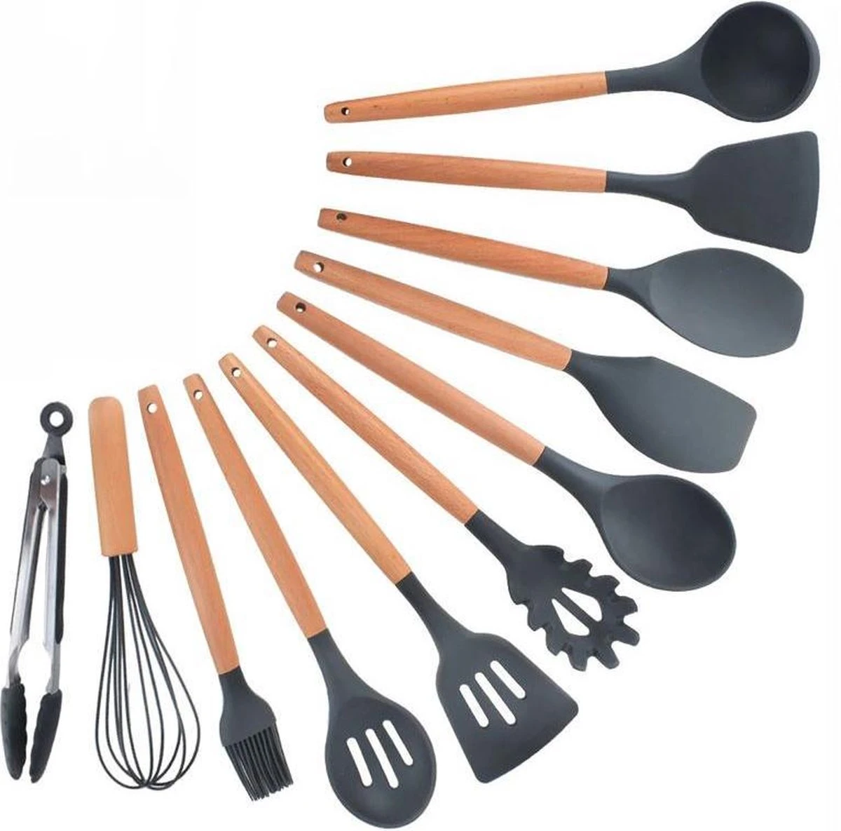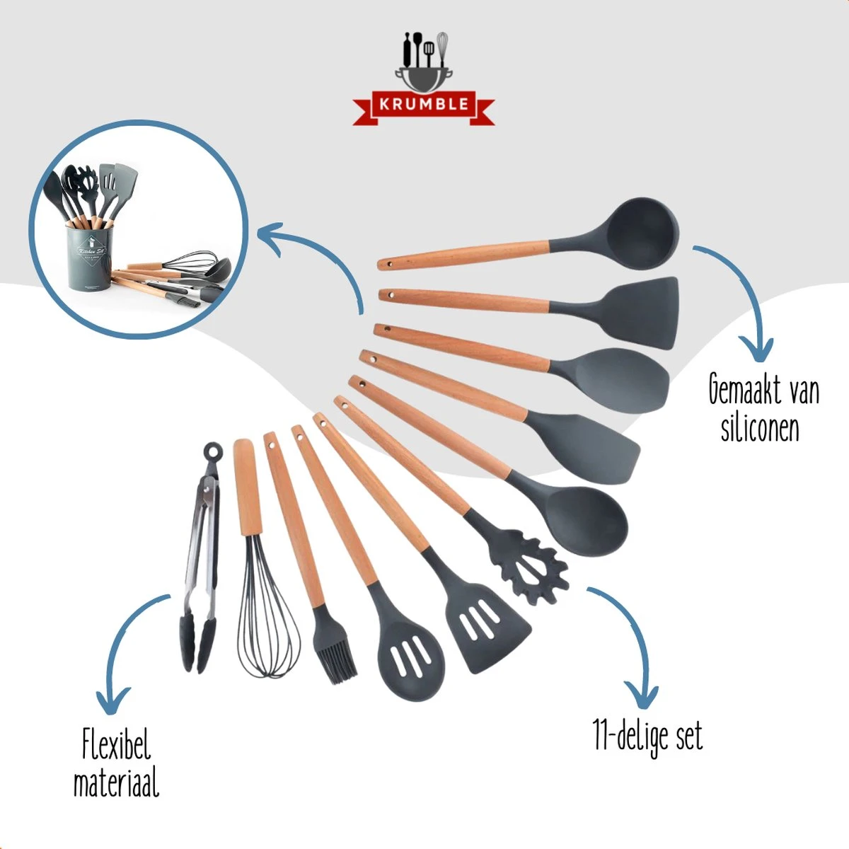 Krumble Siliconen kookgerei 11-delige set / Ophangbare set / BPA vrij / Houten steel – Grijs