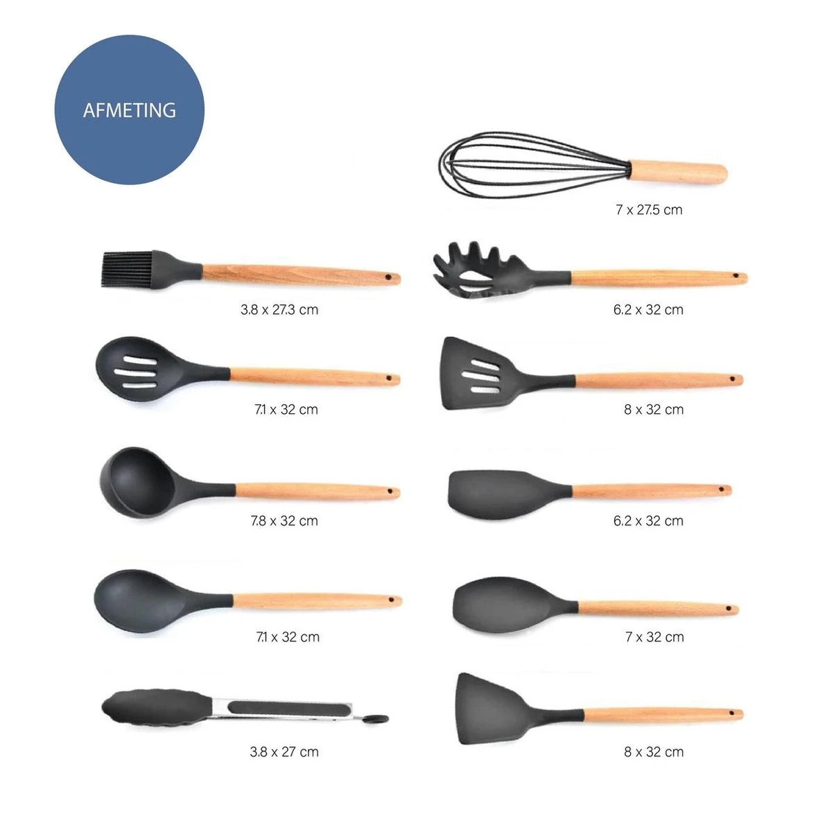 Deze 11-delige set van keukentools is uit siliconen gemaakt en de meeste hebben een houten steel. Ze zijn makkelijk in onderhoud en kunnen eenvoudig met de hand worden afgewassen. Elk item van deze set kookgerei kan opgehangen worden. Het enige wat je nodig hebt is een rekje met haken. Op die manier heb je altijd een overzicht van je tools en neem je onmiddellijk die klopper, spatel of lepel die je op dat moment wilt gebruiken.