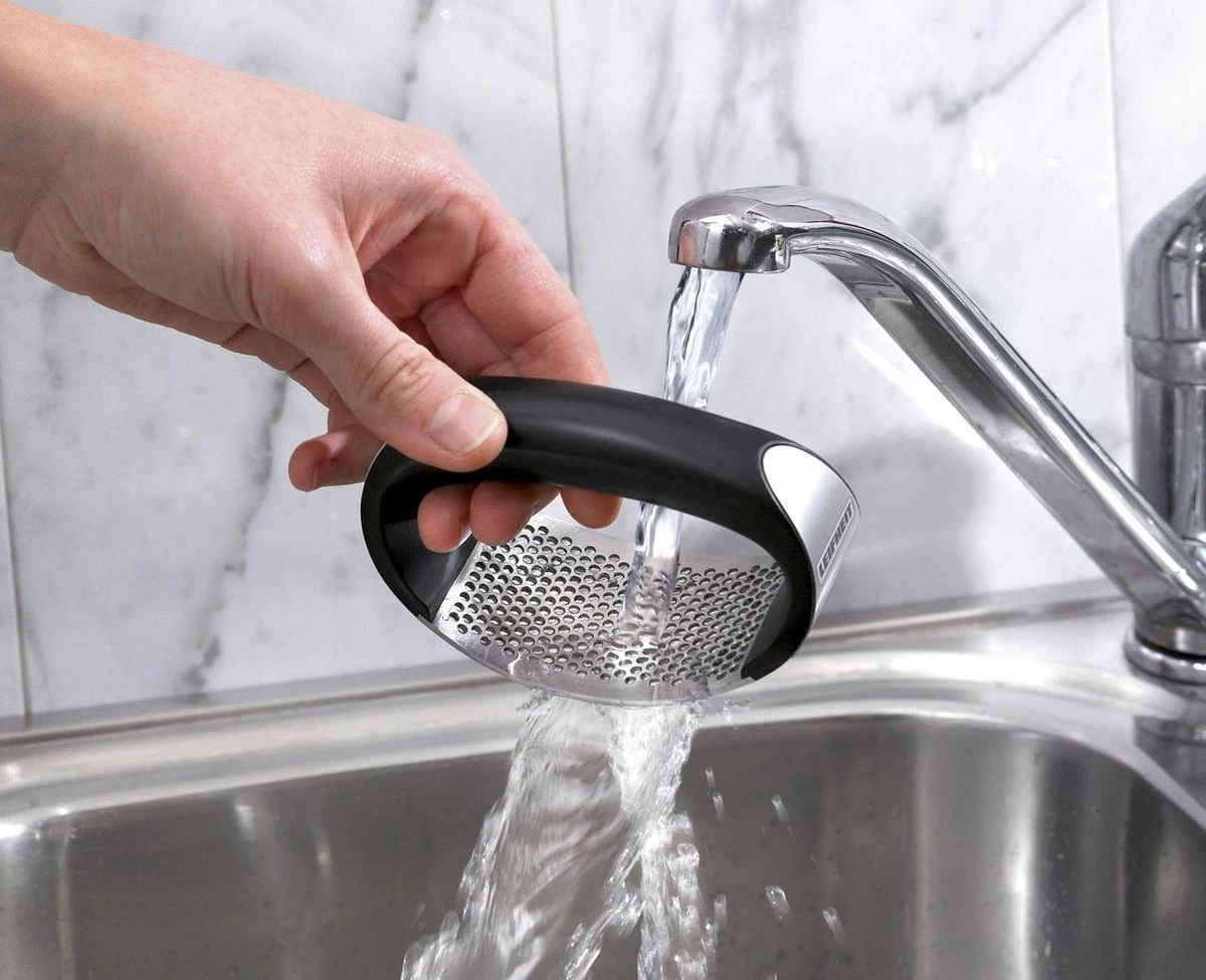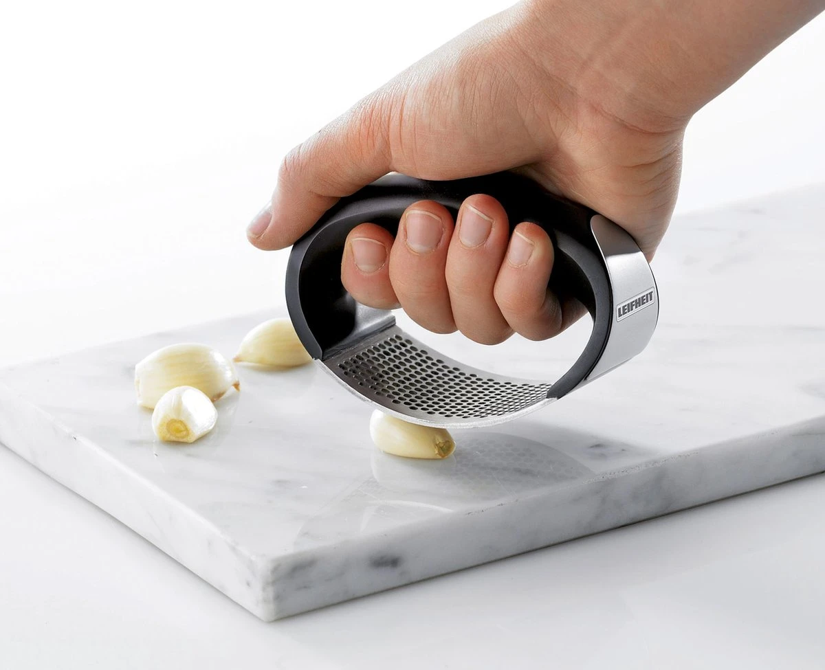 De Knobi King van Leifheit is een must have voor alle knoflookliefhebbers. Dit innovatieve keukenhulpje werkt simpel en snel en het resultaat mag er zijn – alsof de teentjes met de hand in perfecte blokjes gesneden zijn. De Knobi King plet de knoflookteentjes niet, maar snijdt ze. Één keer drukken met de pers is voldoende: het knoflookteentje wordt door het plaatje met de gestanste gaatjes perfect in heel kleine blokjes verdeeld. Na gebruik kan deze handige pers gewoon in de vaatwasser.