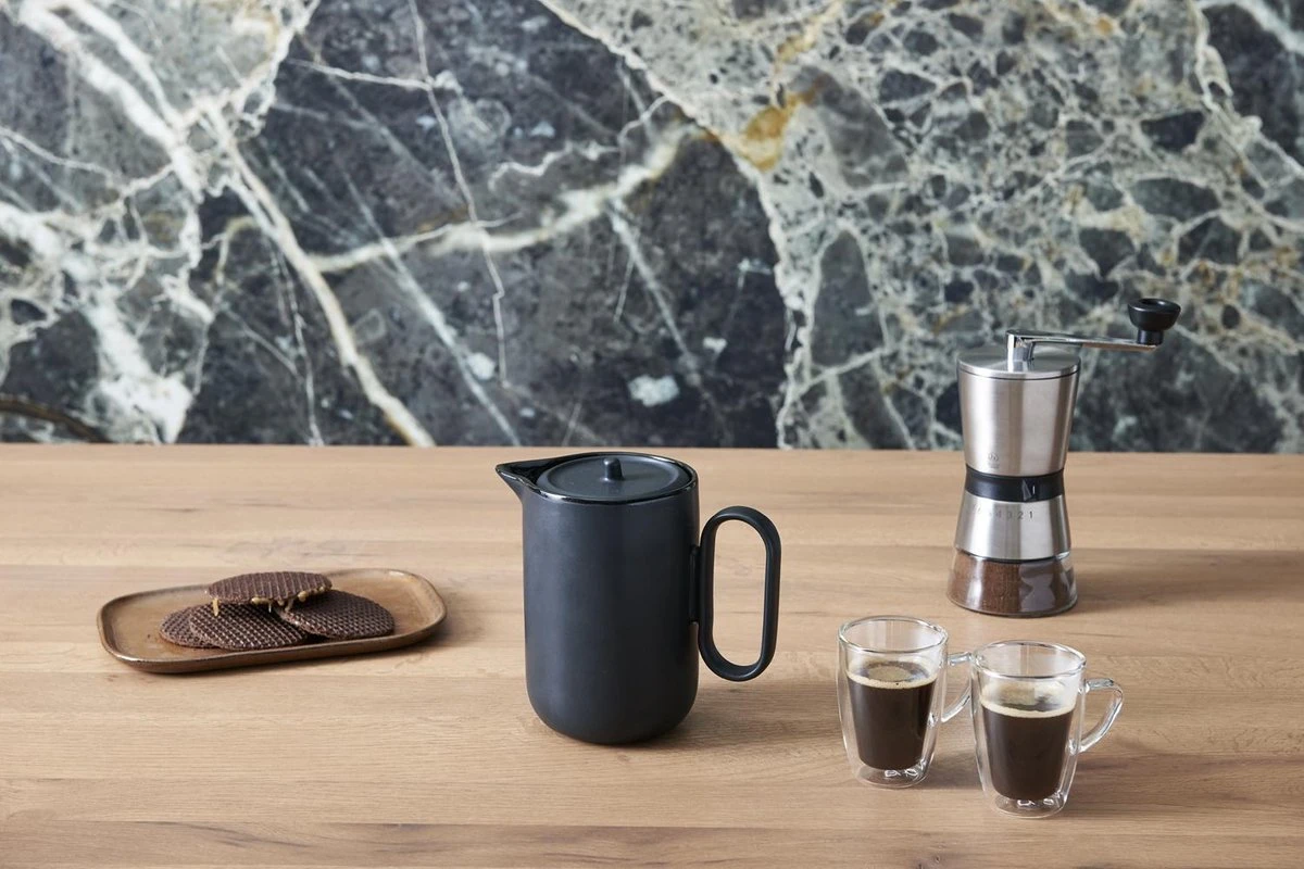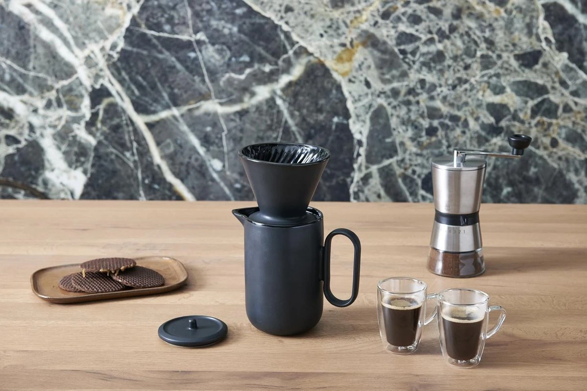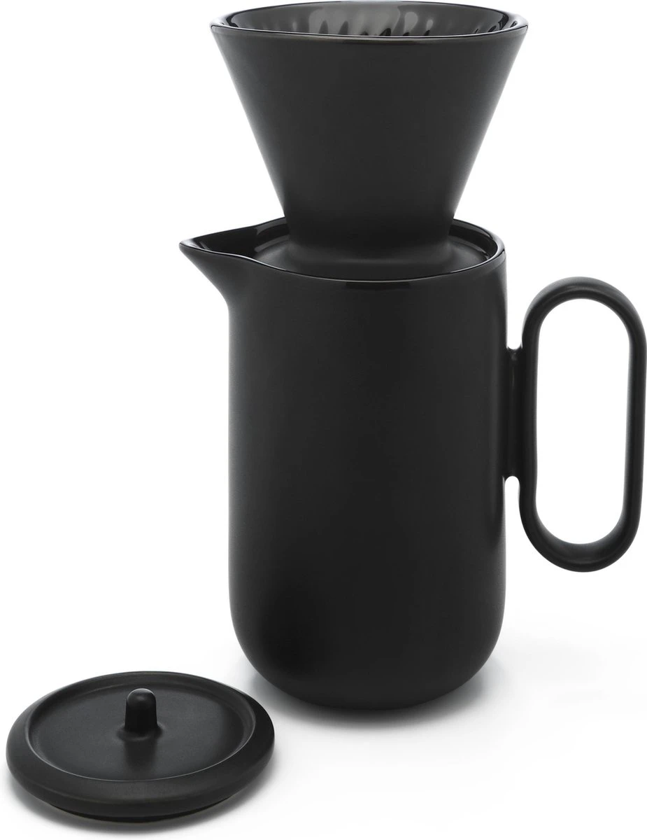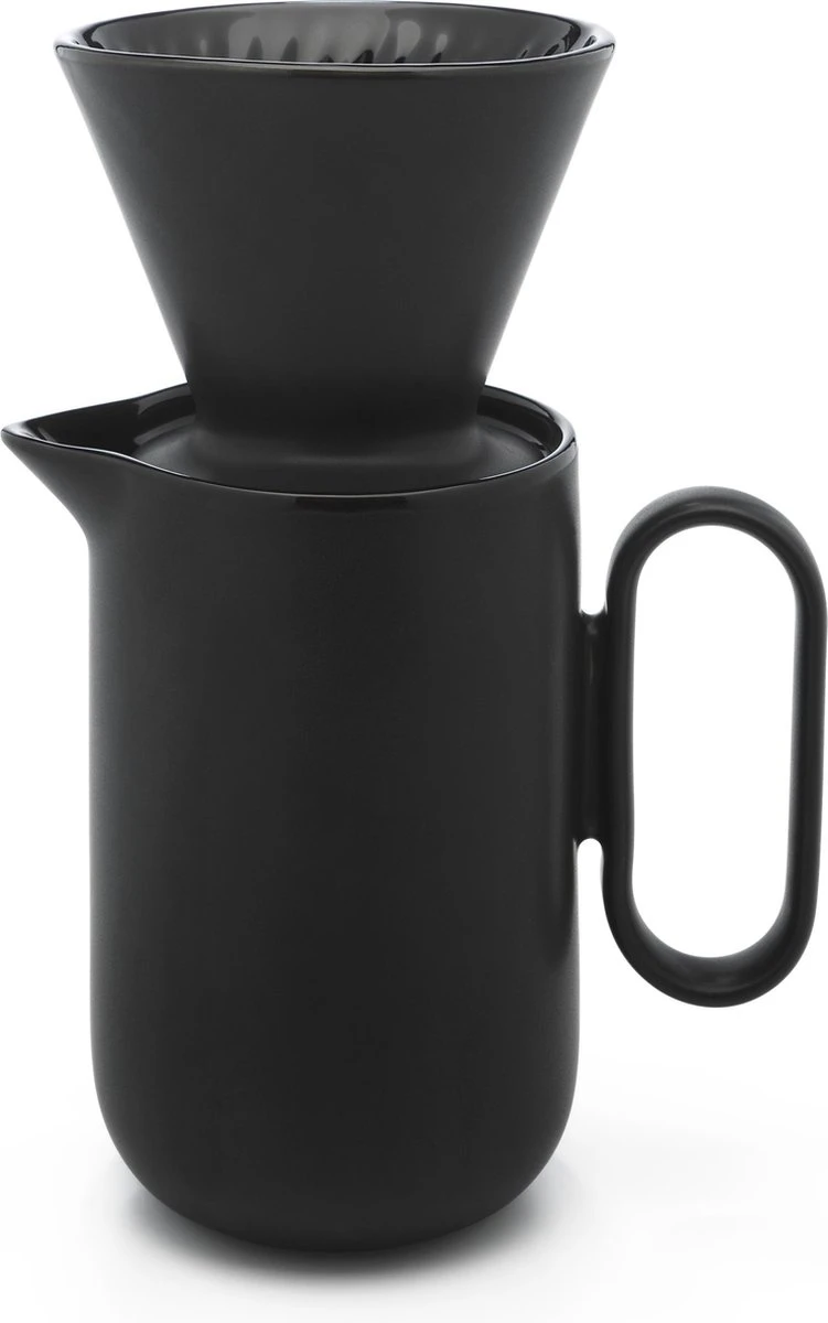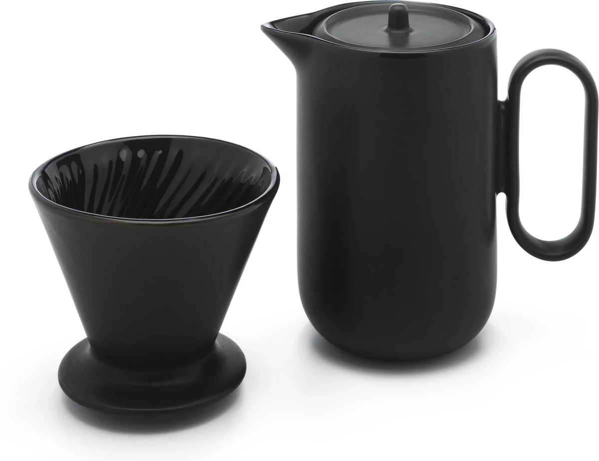 De koffieset is uitgevoerd in keramiek en in diepzwart en mag in de vaatwasser gereinigd worden. In het filter passen de papieren filters type 4.