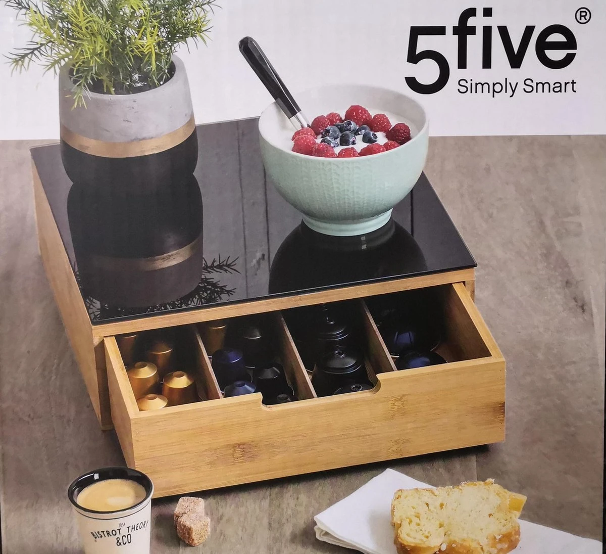 Bamboe is een populair materiaal voor keukenartikelen. Het is namelijk stevig en waterbestendig, en heeft daarnaast ook nog eens een luxe uitstraling. Het strakke design van de koffiecapsulehouder in combinatie met de warme kleur van het materiaal, is de capsulehouder een stijlvol item in je keuken. Daarnaast is bamboe ook een duurzamer alternatief dan andere materialen, omdat bamboe zeer snel groeit op een relatief klein stuk grond. Daarnaast heeft bamboe een lange levensduur, en ben je ervan verzekerd dat deze koffiecup houder lang mee gaat. Als je op zoek bent naar nog meer bamboe organizers, kijk dan eens bij de Bamboo Kitchen collectie van Five®.
