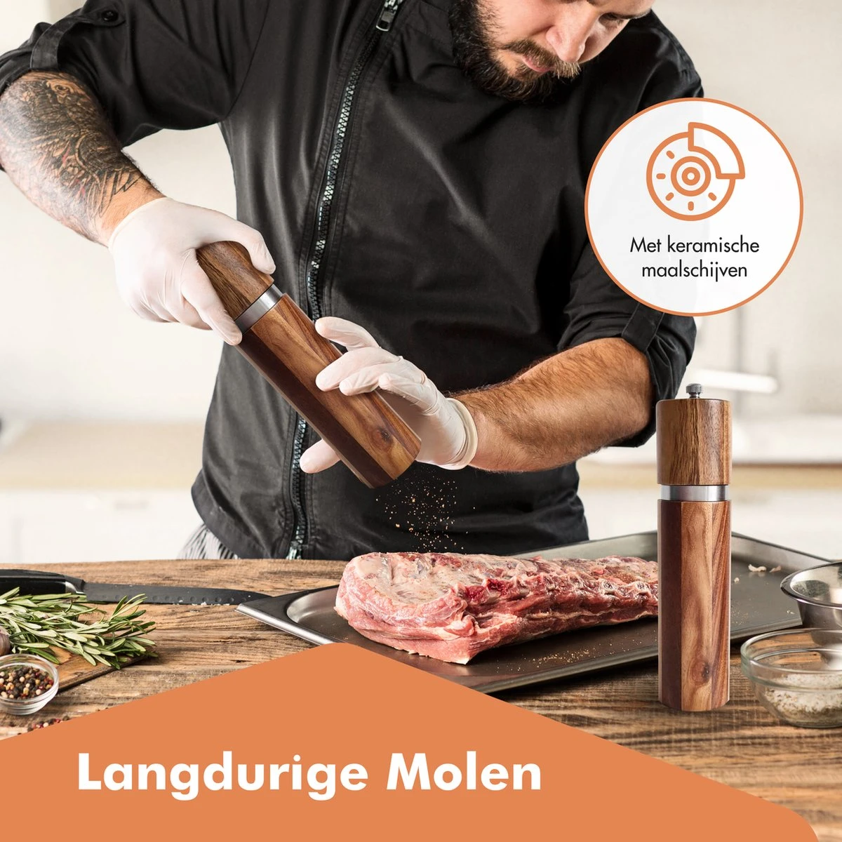 Deze luxe peper en zoutmolen zijn gemaakt van Acacia hout peper en worden handmatig geproduceerd volgens hoge standaard. Dit kunt u herkennen aan de verwerking van RVS in combinatie met het diep donkere hout. Deze molens zijn voorzien van keramische maalschijven die langdurig mee gaan, zodat u alle specerijen optimaal kunt vermalen en dat u er jaren lang plezier van zult hebben. Uw gasten zullen met gemak deze molen kunnen bedienen en er zal geen residu achterblijven zodat het “grinden” soepel blijft.