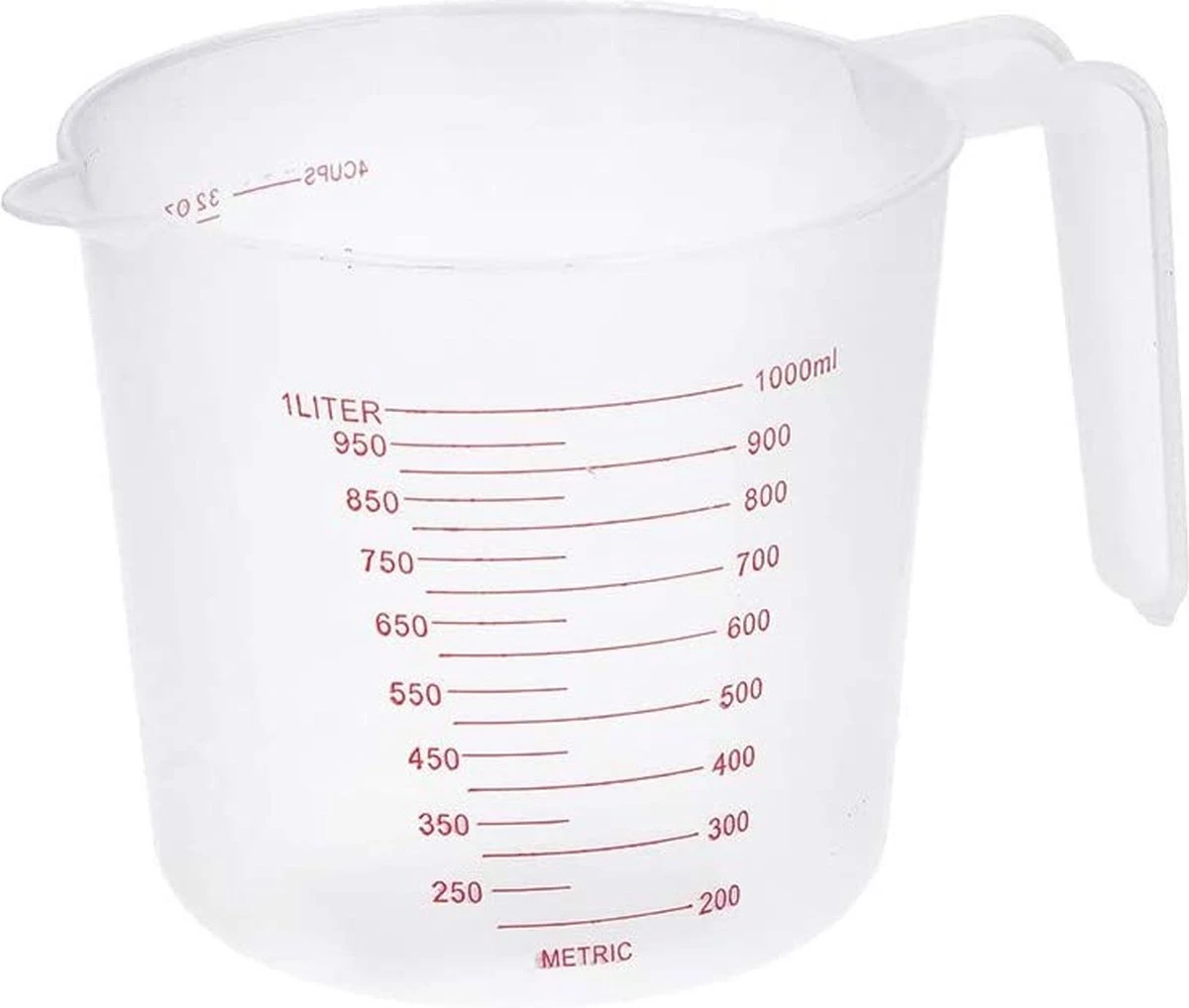 Deze maatbeker met schaalverdeling is ideaal voor het nauwkeurig afmeten van vloeistoffen en heeft een inhoud van één liter.