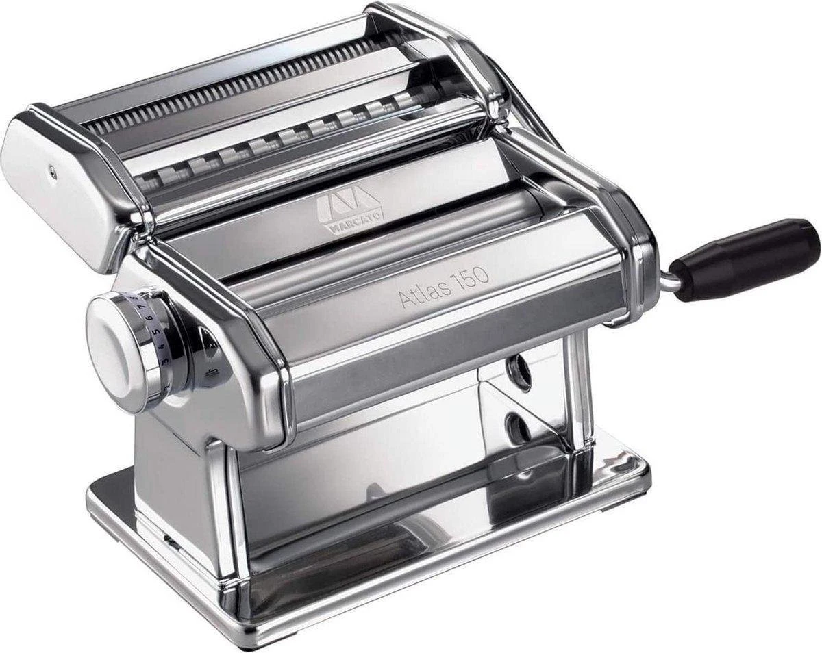 De Atlas 150 van Marcato is de traditionele verchroomde pastamachine voor het maken van verse pasta. Met zijn simpele en elegante uitstraling is hij zonder twijfel de mooiste in zijn soort. Deze machine geeft je direct de mogelijkheid om 3 pasta vormen te maken, lasagne, fettuccine (6mm) en tagliolini (1,5 mm). Dankzij deze machine kan je thuis genieten van de pasta die je zelf met liefde heb gemaakt.