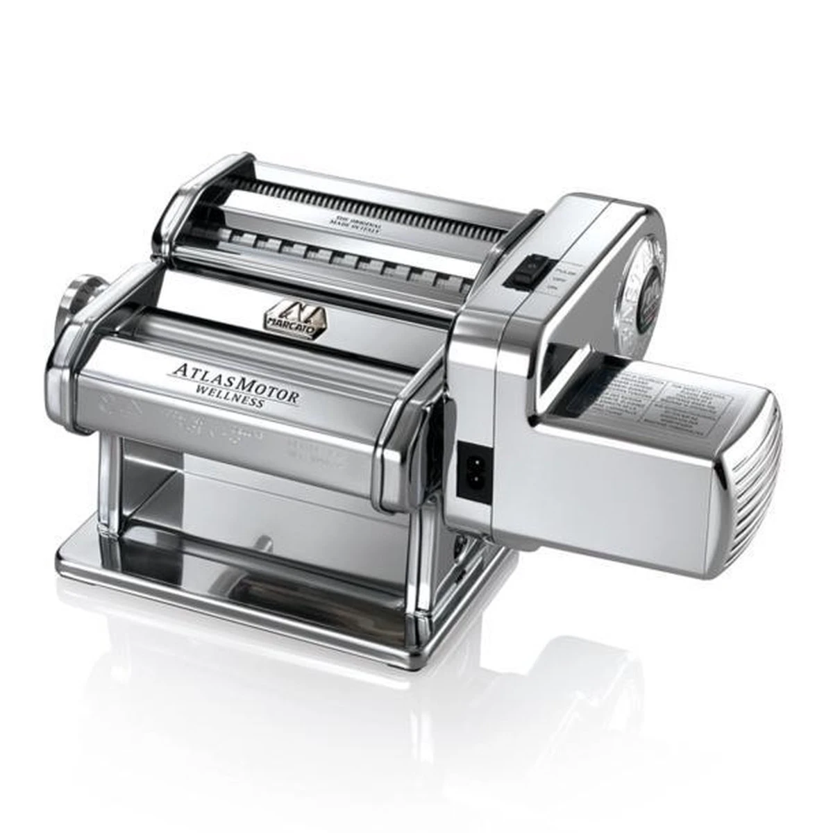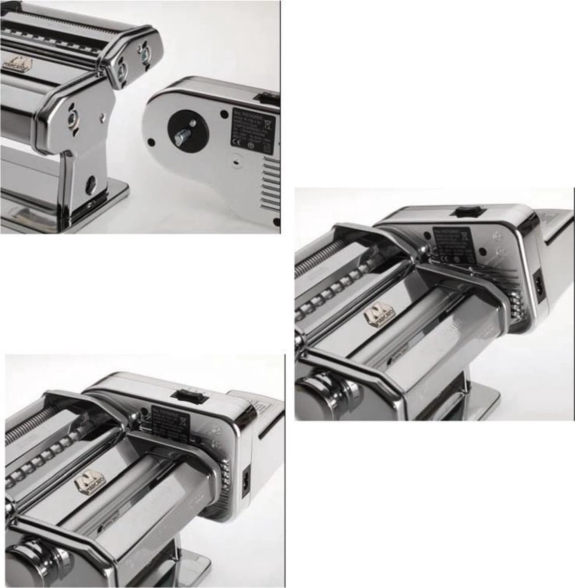 Deze Marcato Atlas motor pastamachine is gemaakt van hoogwaardig verchroomd staal, de messen en walsen van de machine zijn van geanodiseerd aluminium. Dit materiaal voorkomt dat er lood-, chroom- en cadmiumdeeltjes kunnen achterblijven op het deeg. Op de messen zit bovendien nog een extra acetaat beschermlaag. De machine is geschikt voor drie soorten pasta: lasagne, fettuccine en tagliolini. De kop van de pastamachine is verwisselbaar en daardoor is het apparaat uit te breiden met diverse Marcato hulpstukken. Kenmerken Marcato Atlas Motor pastamachine: Deze machine uit te breiden met diverse opzetstukken Inclusief een opzetstuk Inclusief volautomatische motor (220v)