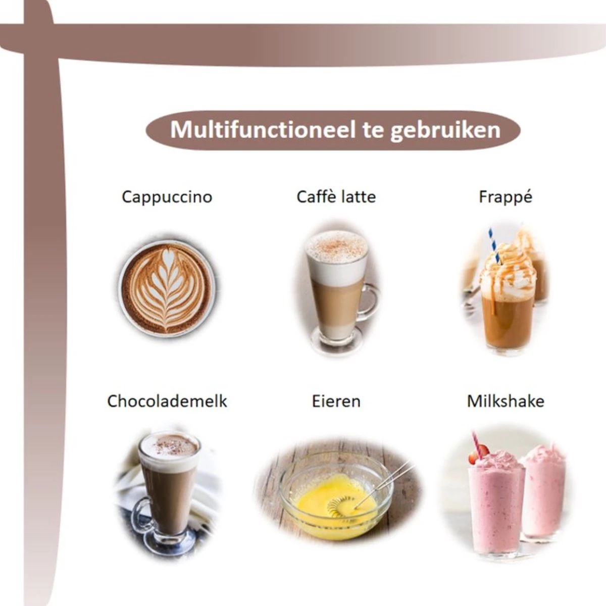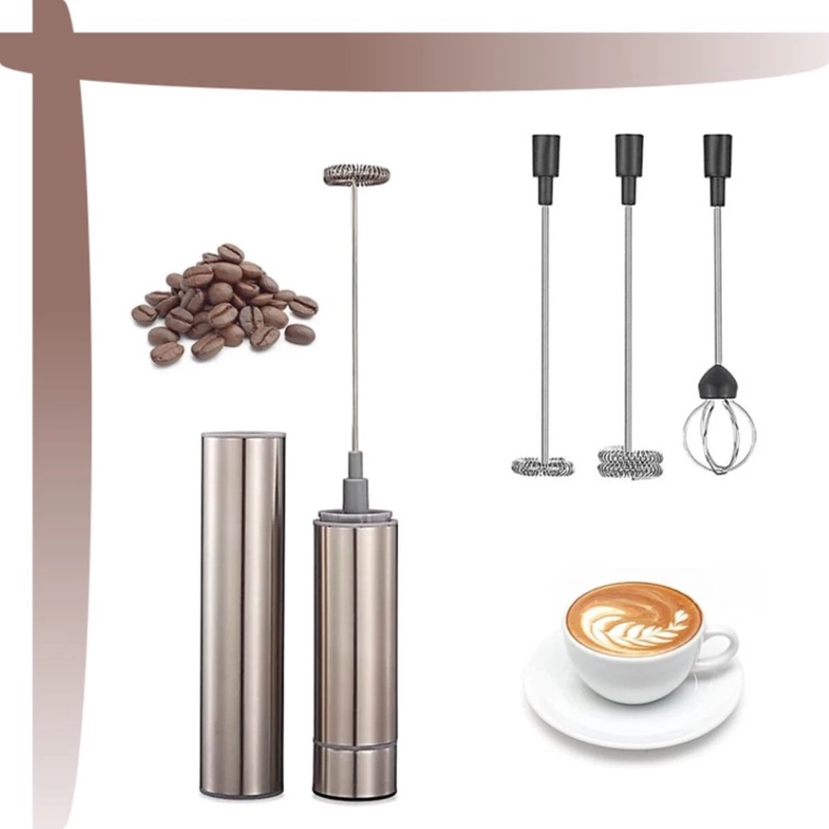 De Melkopschuimer wordt geleverd met 3 verschillende opzetstukken. Elk opzetstuk heeft zijn eigen functie; de 1-laags opschuimer is bedoeld voor het produceren van melkschuim voor 1-2 personen/kopjes. De 2-laags opschuimer kan gebruikt worden voor schuim voor 3 tot meerdere personen. Het 3e opzetstuk betreft een mini-garde die multifunctioneel ingezet kan worden voor bijv. het opkloppen van eieren of voor het bereiden van beslag.