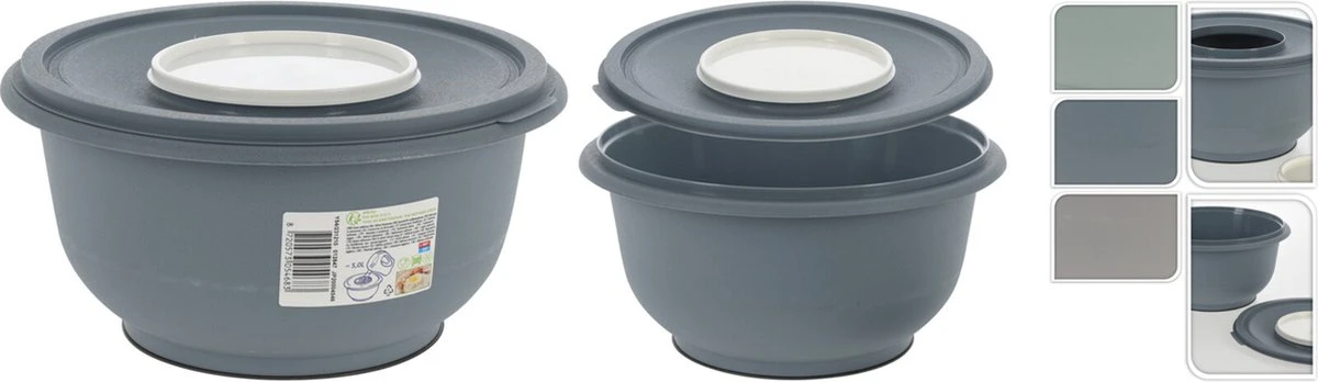 Maak eenvoudig en snel je beslag aan met deze strak vormgegeven beslagkom met een inhoud van 5 liter . Bovenzijde van het deksel is voorzien van een tweede wat kleinere deksel zodat je met je mixer kunt mixen zonder te spetteren .