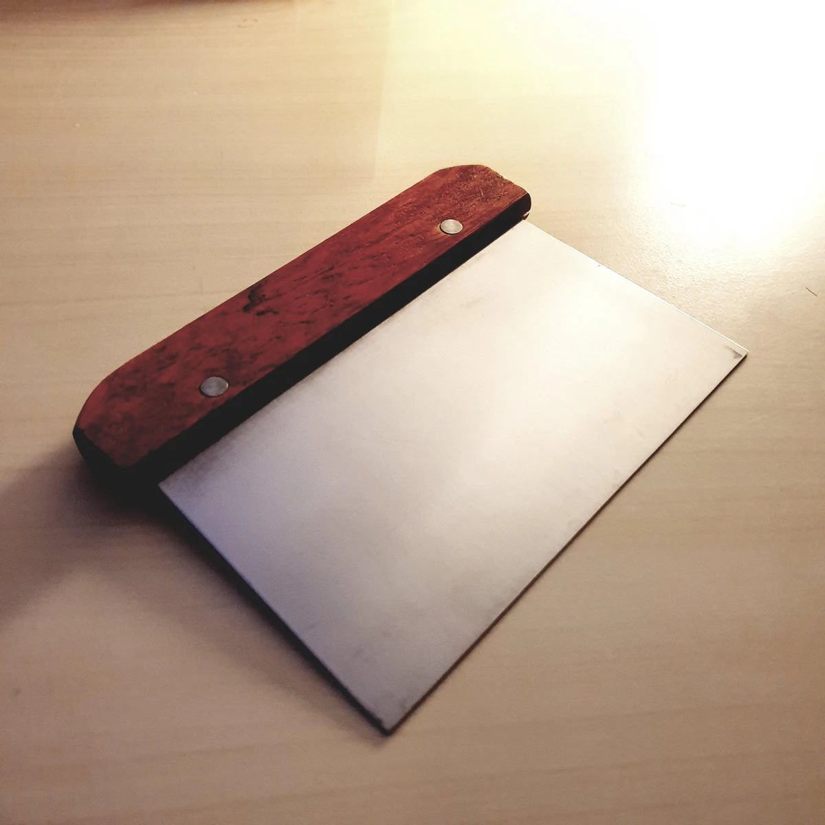 Deze RVS deegschraper is mooi afgewerkt met een rood en bruin houten handvat. De deegschraper, ook bekend als deegsteker is gemaakt van sterk materiaal.