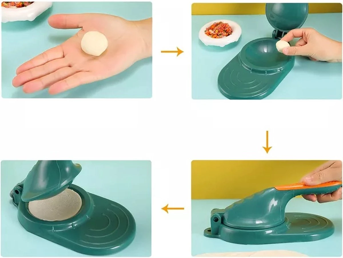 Nadat je zelf het deeg hebt gemaakt maak je een klein balletje van het deeg en plaats je deze in de meegeleverde pers. Druk deze aan en voila je hebt een dumplingvelletje.