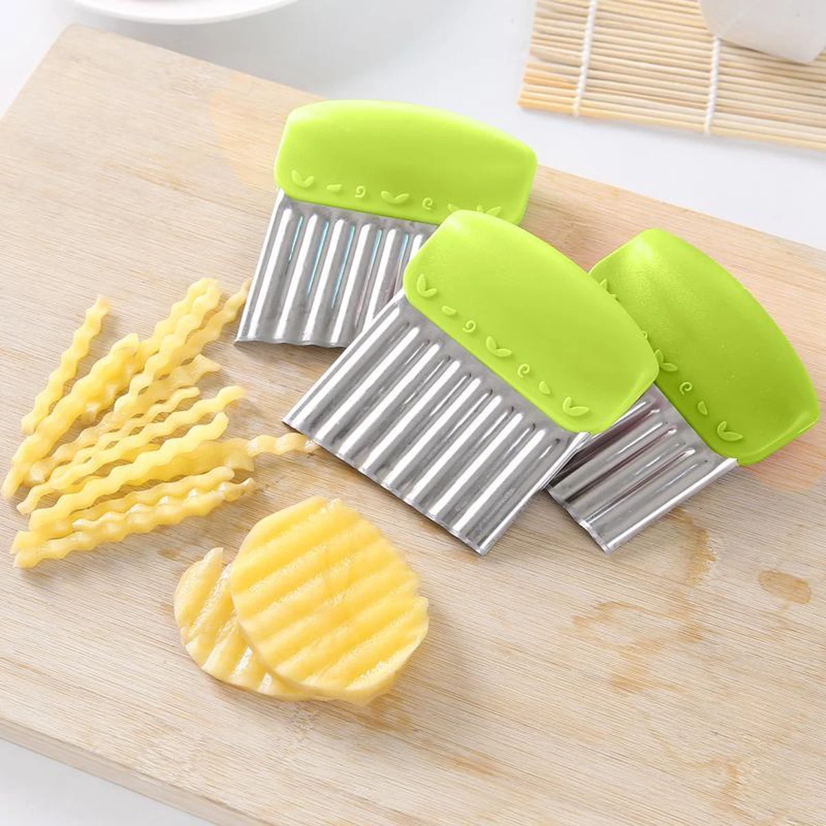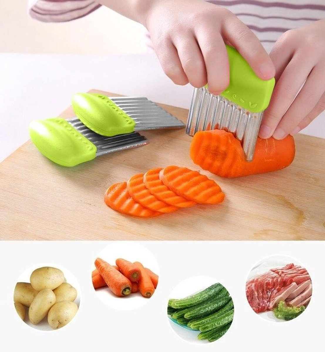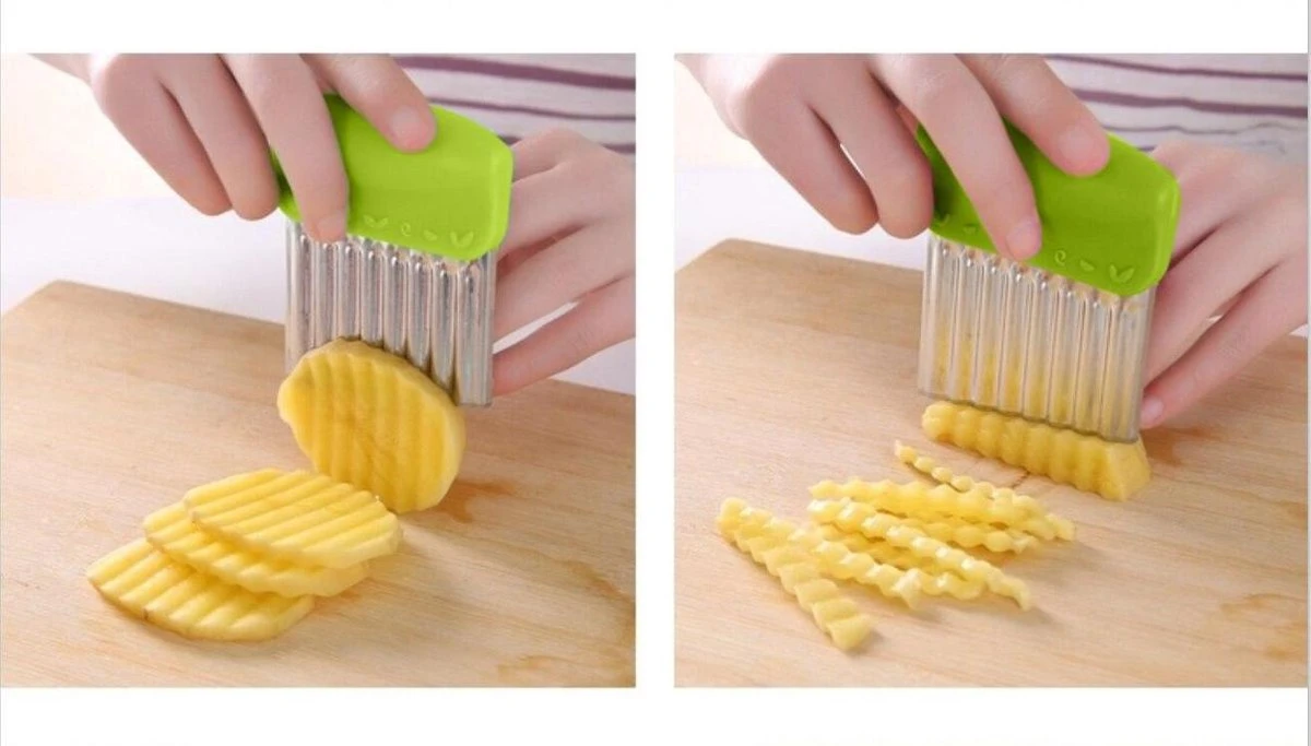 Met dit multifunctionele ribbelmes kunt u voortaan golvende plakjes, blokjes of staafjes groenten, fruit of kaas snijden in zig-zag formaat. Het golvende ontwerp zorgt niet alleen voor een stijlvolle indruk van uw gerechten, maar geeft bijvoorbeeld frietjes ook meer smaak omdat ze over een groter oppervlakte gebakken worden.
