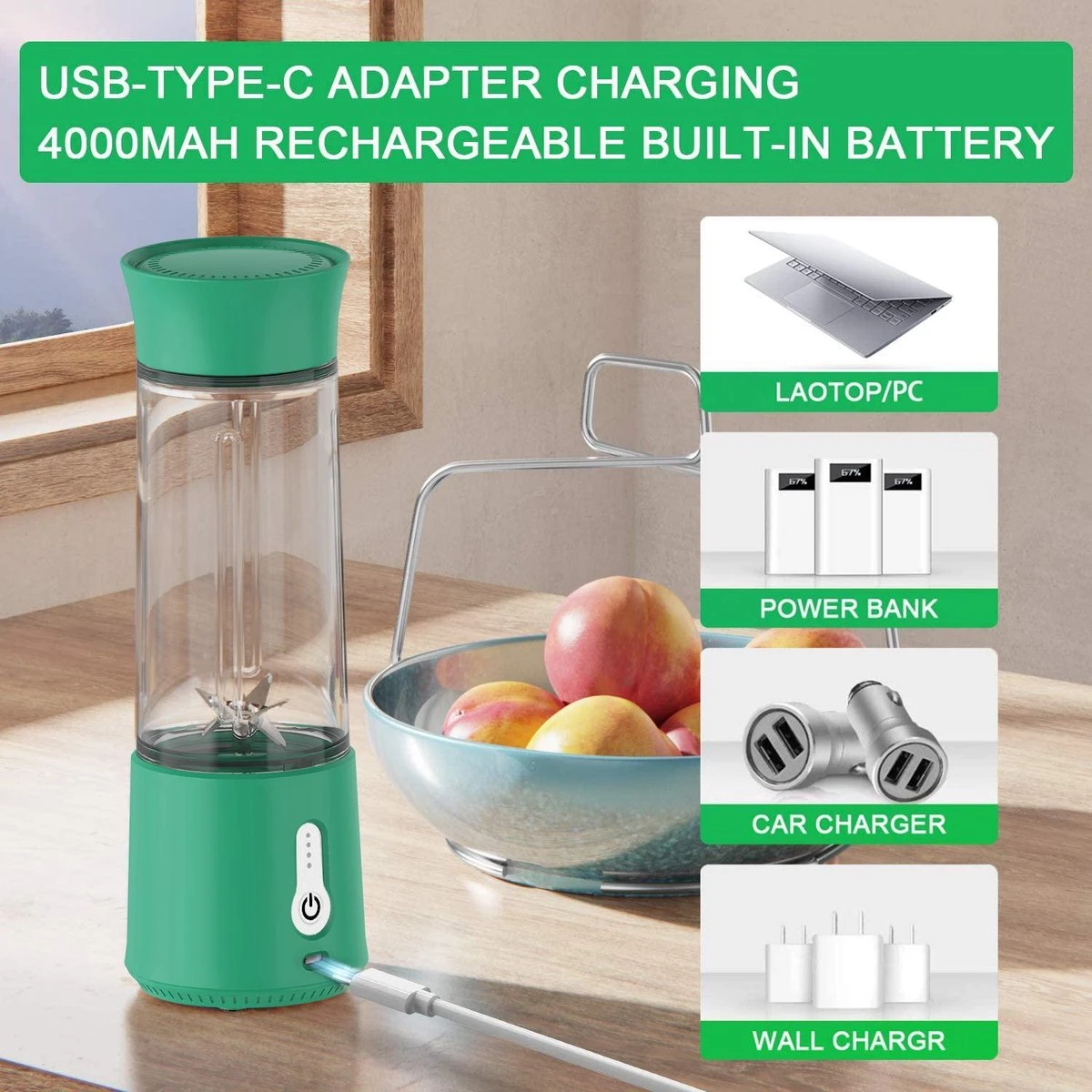 De draadloze blender wordt geleverd inclusief een USB-C kabel.