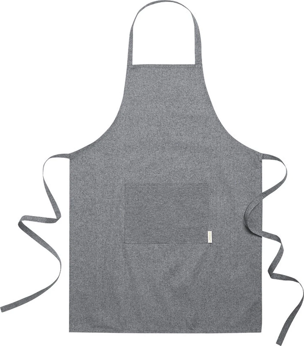 Natuurlijn schort, gemaakt van gerecycled katoen. Met een voorzak en verstelriempjes, passend onder de knie. Verkrijgbaar in het zwart/grijs, met gerecycleerd katoen dat opvalt in het label.