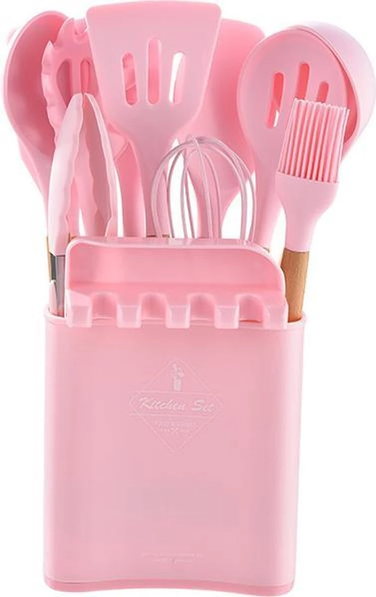Als je staat te koken heb je altijd allerlei verschillende atributen nodig. De ene spatel ligt in dat kastje en de pollepen in het andere kastje. Je loopt te zoeken en tegelijk moet je ook je pannen in de gaten houden. Dit is de oplossing alle spullen 10 atributen in een houder binnen handbereik en het roze setje staat ook nog heel leuk op het aanrecht. De modern vormgegeven set is vervaardigd van hoogwaardige siliconen, is BPA-vrij en hittebestendig tot maximaal 230°C.