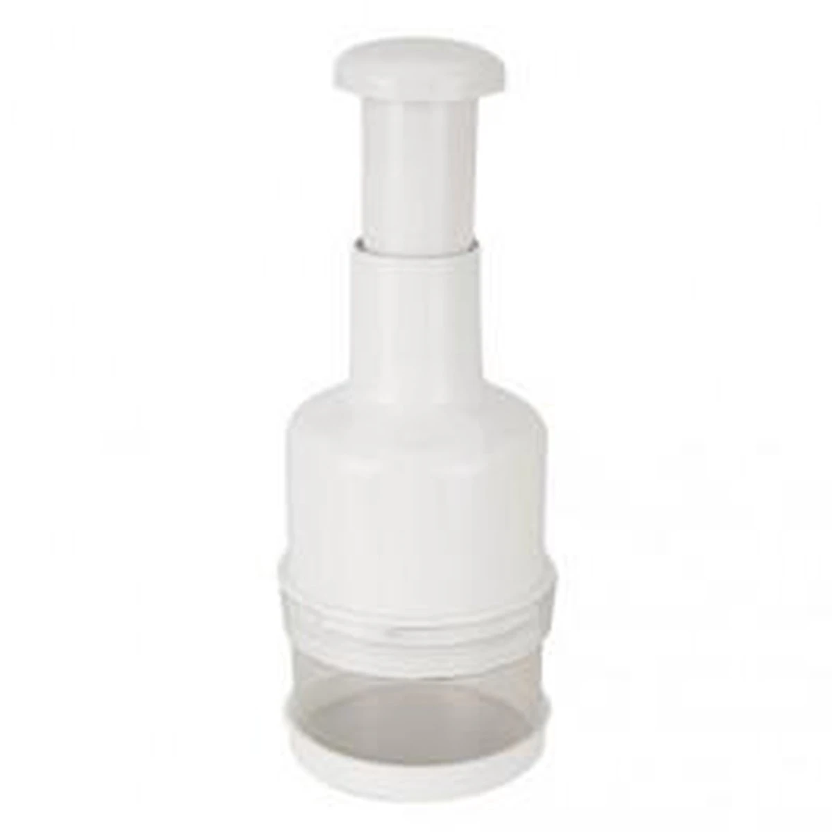 Dit is de manuele groentehakker! Je kan hem gebruiken voor het snijden en hakken van groenten veel makkelijker te maken. Druk de bovenkant naar beneden en de bladen aan de binnenkant zullen automatisch gaan draaien en de groenten versnijden. De manuele groentehakker is gemaakt van resistente plastic en roestvrij stalen bladen. Hij neemt erg weinig ruimte in beslag, is lichtgewicht en erg makkelijk schoon te maken. Geschatte afmetingen: 22 cm hoog x 8 cm diameter.