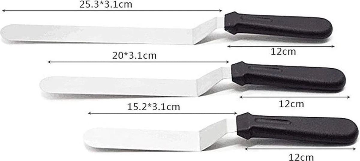 De paletmessen van XYZ Goods zijn ontwerpen met plastic handvatten voor een goede grip, optimaal comfort en controle terwijl u uw taart decoreert. Het materiaal is perfect voor direct contact met voedsel. Het is niet giftig en het ruikt niet. Daarnaast bieden de roestvrijstalen messen voor optimale duurzaamheid voor jarenlang gebruik. De messen zijn makkelijk schoon te maken. De messen komen in 3 verschillende lengtes: 27cm, 32cm en 37cm en is geweldig voor het glazuren van gebak, koekjes, pannenkoeken, taarten en cupcakes. Het decoreren van een taart wordt dankzij de paletmessen voor iedereen eenvoudig.