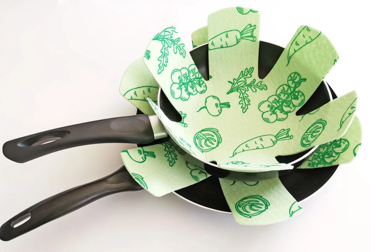 GEBRUIK: Gebruik de panbeschermer bij het op elkaar stapelen van de pannen. Leg de panbeschermer tussen de pannen en voorkom krassen en breuken aan de anti-aanbaklaag van uw pannen. Deze beschermers zijn flexibel, anti-slip en beschermen ook de randjes.