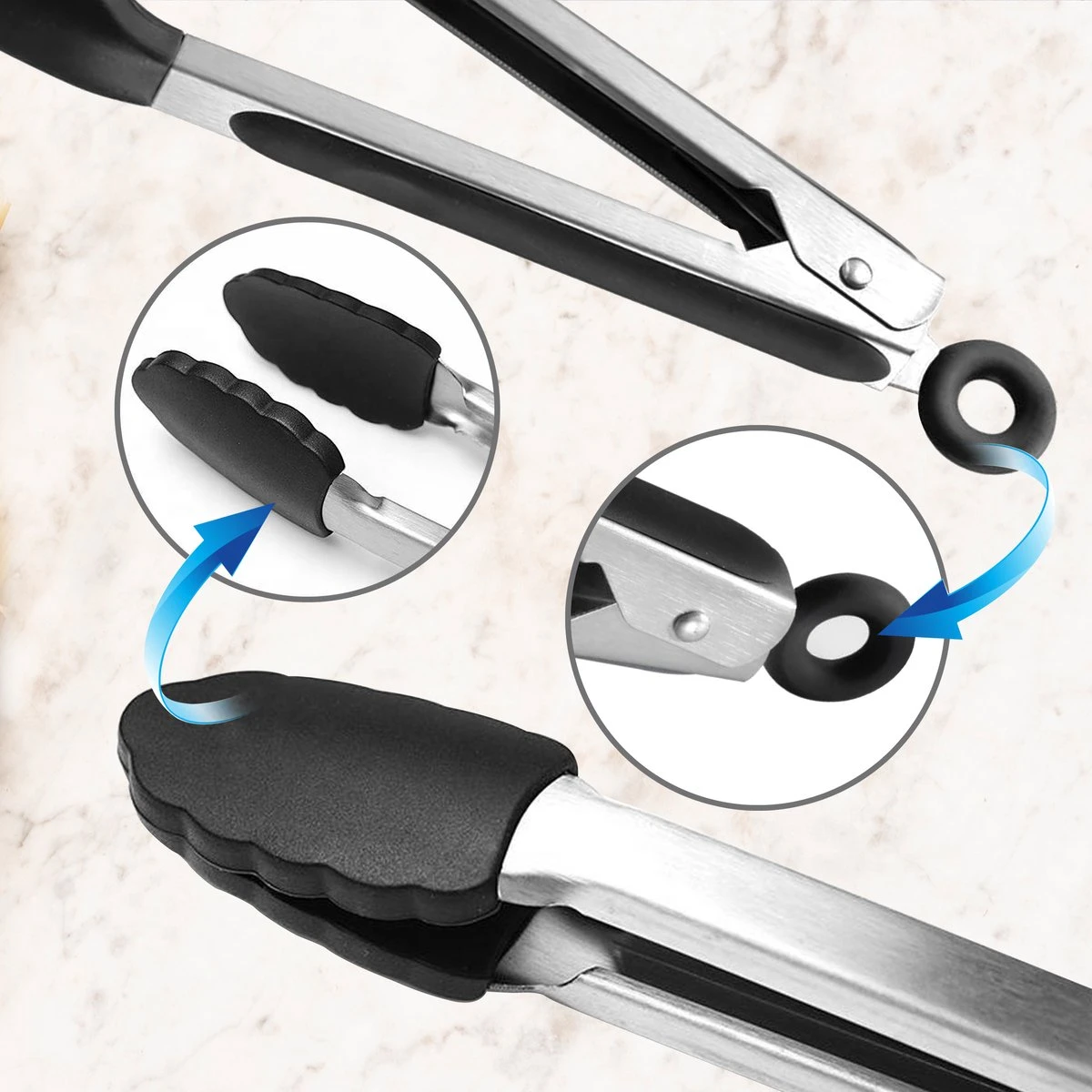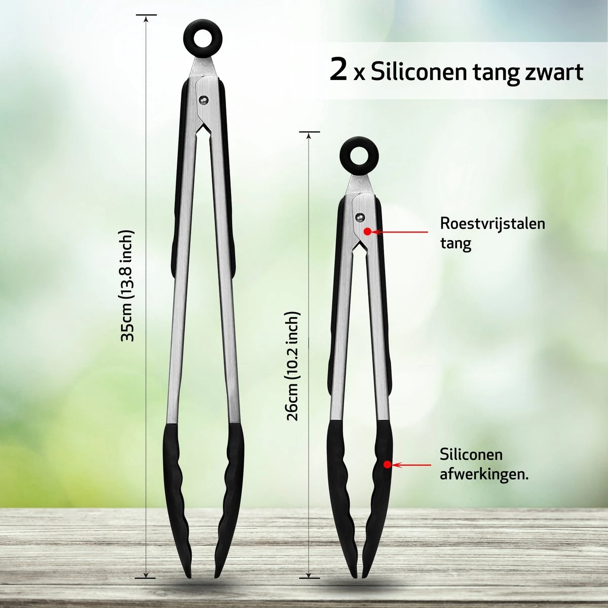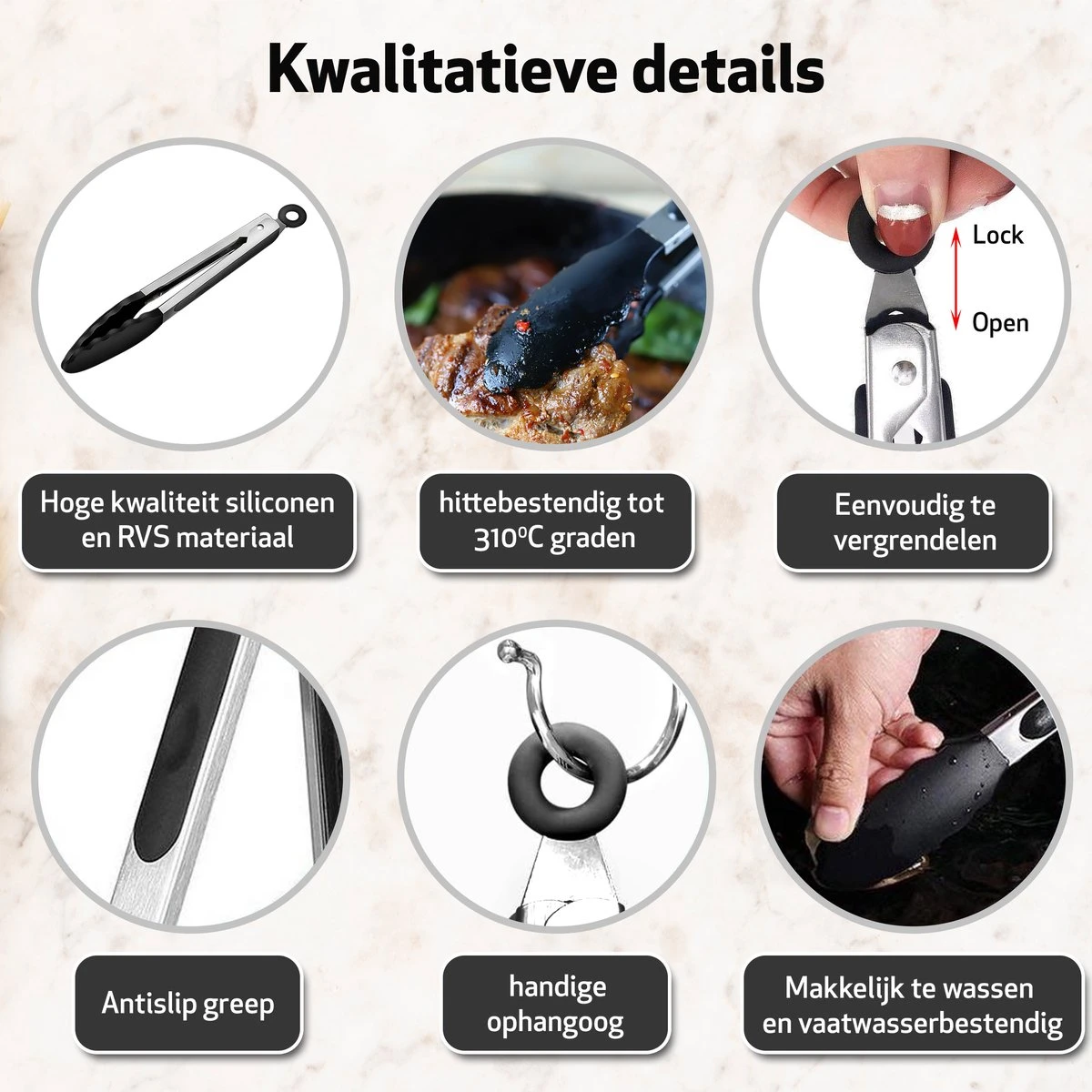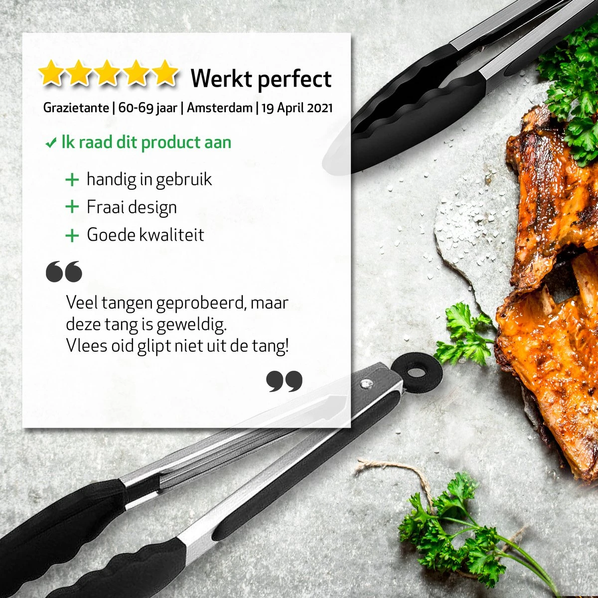 Als je de bovenste ronde knop naar buiten schuift, blijft de tang in gesloten positie. De siliconen gedeeltes van de tangen zorgen voor een handige en ruwe grip zodat u gemakkelijk kan koken en/of barbecueën. Je kan de serveertangen makkelijk opbergen doordat je de tangen op slot kunt zetten, waardoor ze ingeklapt blijven. Het zachte siliconen is geschikt voor gebruik in pannen met een antiaanbaklaag.