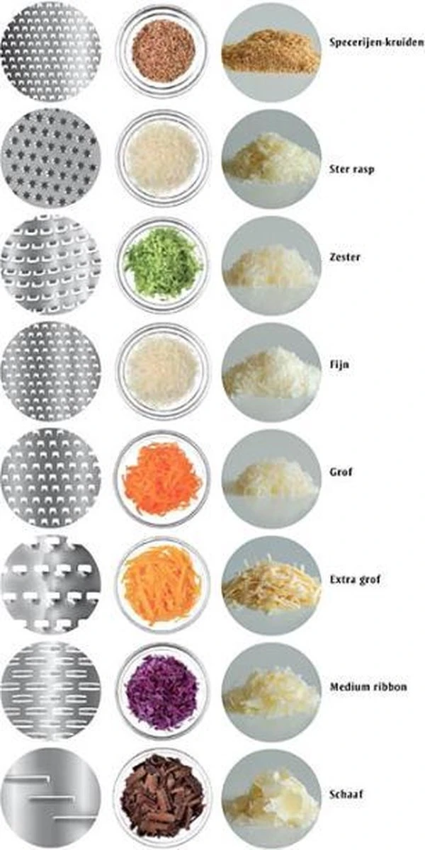 | Aanvullende functies | Ideal für Käse, Schokolade, Zitronen- und Orangenschalen |