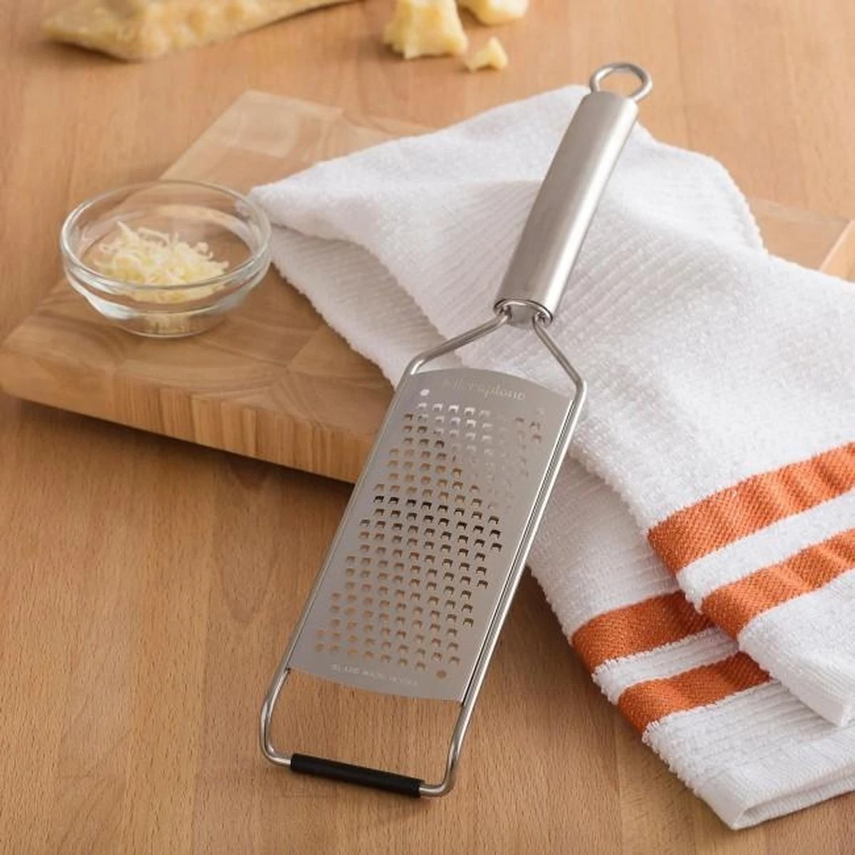 Microplane Rasp GrofIn de serie Professional van het merk Microplane bevinden zich een aantal raspen, waaronder de Microplane Rasp Grof. De raspen van Microplane zijn de enige raspen welke lasergesneden zijn. Dit onderscheid de raspen van vele andere merken en heeft dan ook een positief effect op de levensduur van de raspen. Deze rasp is gemaakt van RVS en heeft een totale lengte van 30.5 cm. Het blad is 12.6 x 6 cm groot en is gemaakt van 18/10 RVS. De rasp is onder andere geschikt voor het raspen en schaven van kleine producten, zoals noten en chocoladesnippers.Microplane Rasp OnderhoudDe rasp wordt geleverd met een kunststof beschermkap, welke beschadigingen aan de rasp tegengaat. Na het gebruiken van de rasp, kunt u deze eenvoudig reinigen in de vaatwasser.