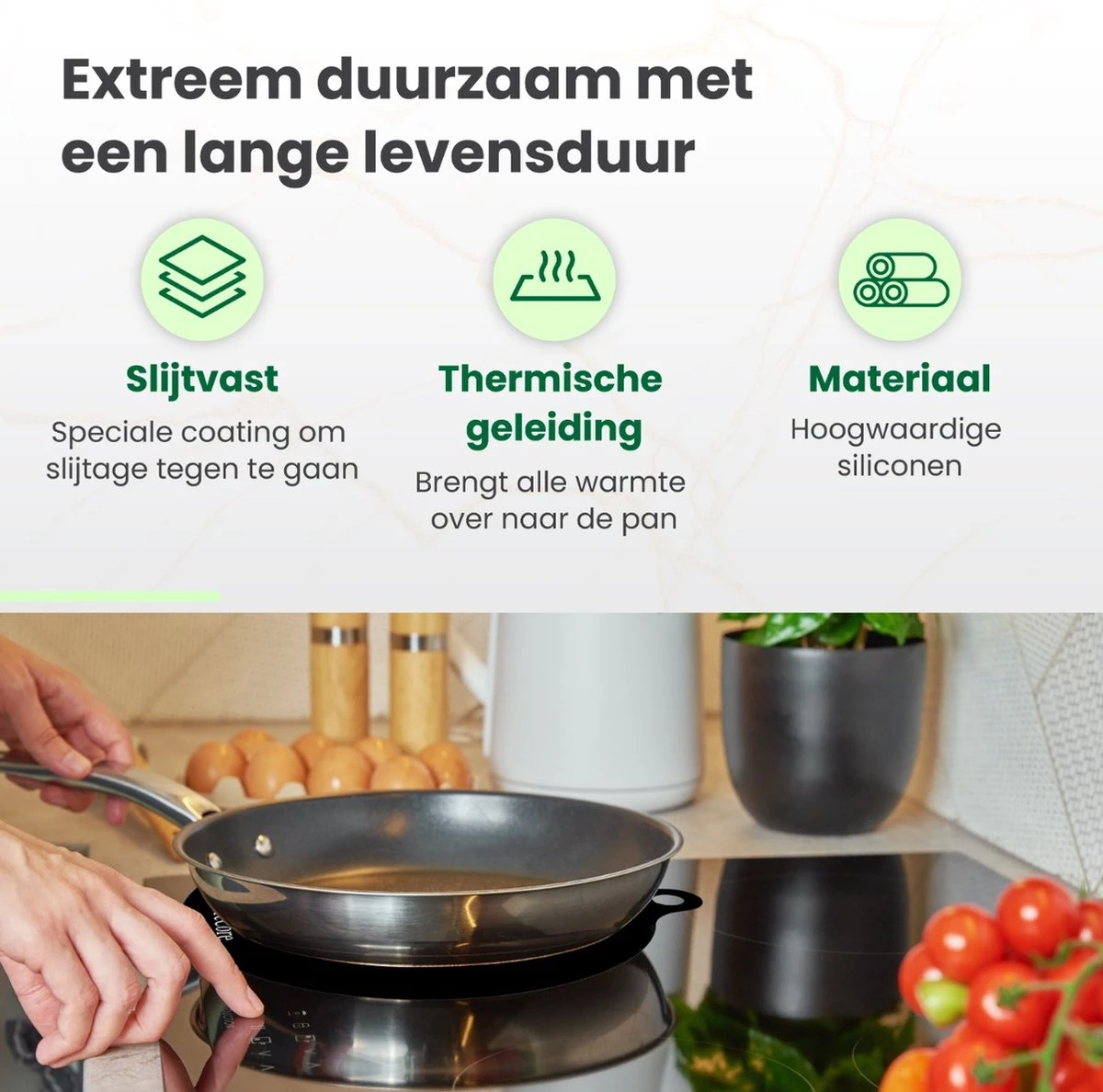 (Siliconen hebben de natuurlijke eigenschap dat ze stof kunnen aantrekken. Verwijder de stof makkelijk door de mat te wassen in warm water en een klein beetje handzeep) - De mat wordt tussen de pan en de inductie kookplaat geplaatst. Het wisselende, magnetisch veld dat in de inductie kookplaat wordt opgewekt, zal via de mat naar de pan getransporteerd worden. In de bodem van de pan ontstaat vervolgens een hevige warmteontwikkeling, waardoor uw eten warm wordt.