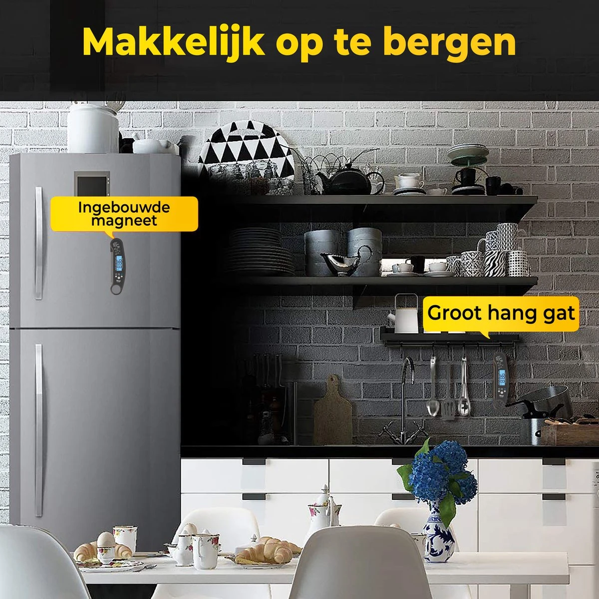 Wanneer je klaar bent met BBQ’en of het meten van de temperatuur bij een ander gerecht kan je de vleesthermometer handig ophangen aan de koelkast. Dit komt door de ingebouwde sterke magneet die aan de achterkant van de thermometer zit. Ook zit er een bieropener op de vleesthermometer, waardoor je ook je bierflessen open kan maken. Ten slotte beschikt de vleesthermometer over een handige ‘Hold-function’ die de mogelijkheid geeft om de data op te slaan en staat de temperatuur per vleessoort op de thermometer aangegeven.