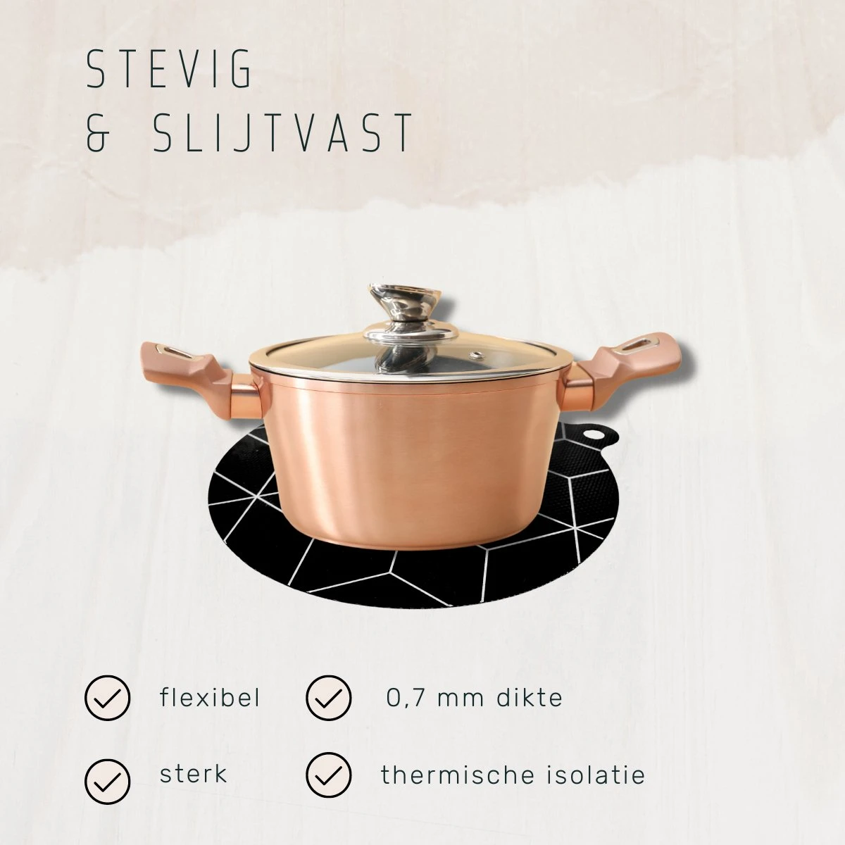 - De mat ligt tussen de kookplaat en de onderkant van de pan in. Hierdoor wordt de warmte gemakkelijk richting je maaltijd geleid.