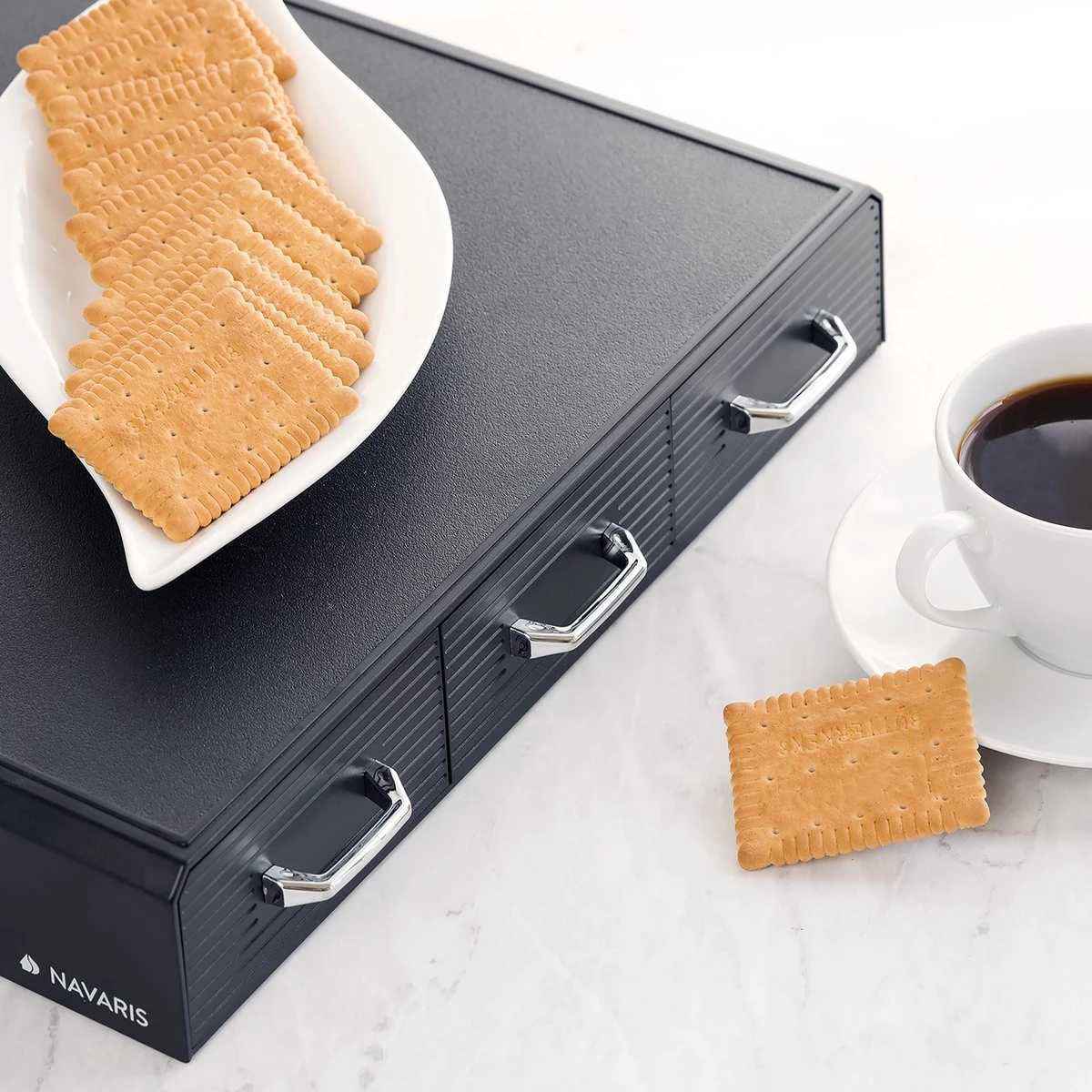 Met de Navaris capsulehouder heb je geen last meer van rondslingerende koffiecups. Je bewaart al je koffiesmaken mooi overzichtelijk onder je espresso apparaat. SLIM ONTWERP