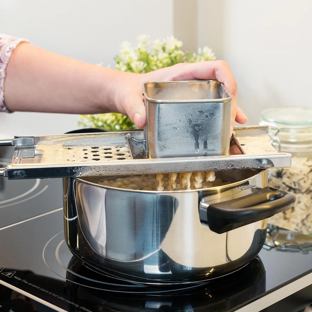 - ZO WERKT HET: Plaats de rasp boven een pan met kokend water. Doe het deeg in het bakje en beweeg het bakje over de rasp. Het deeg valt door de gaatjes direct in het water (pas op voor spetters!). Haal de slierten eruit wanneer ze naar boven drijven.