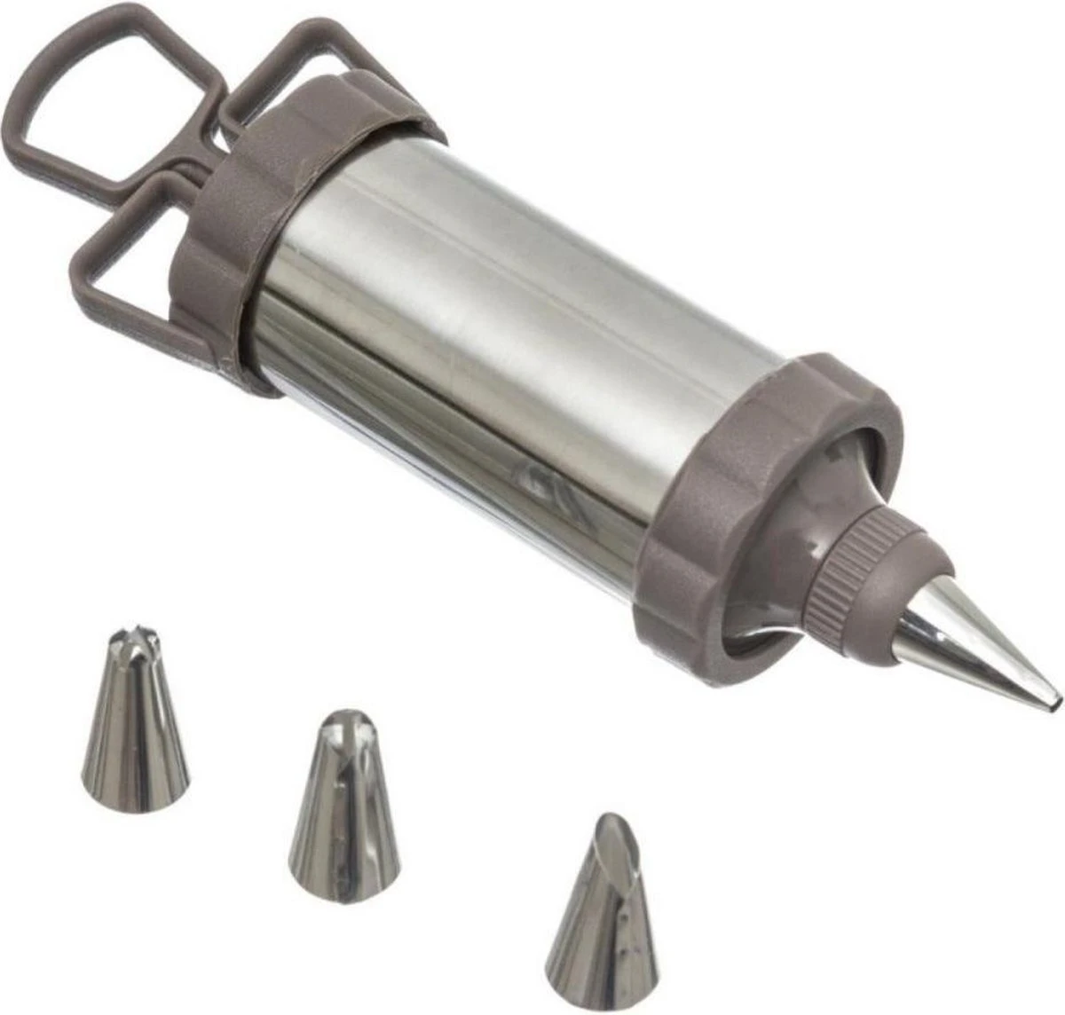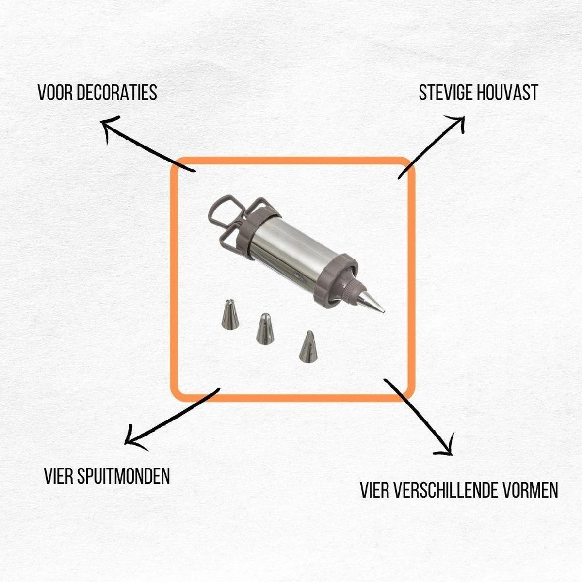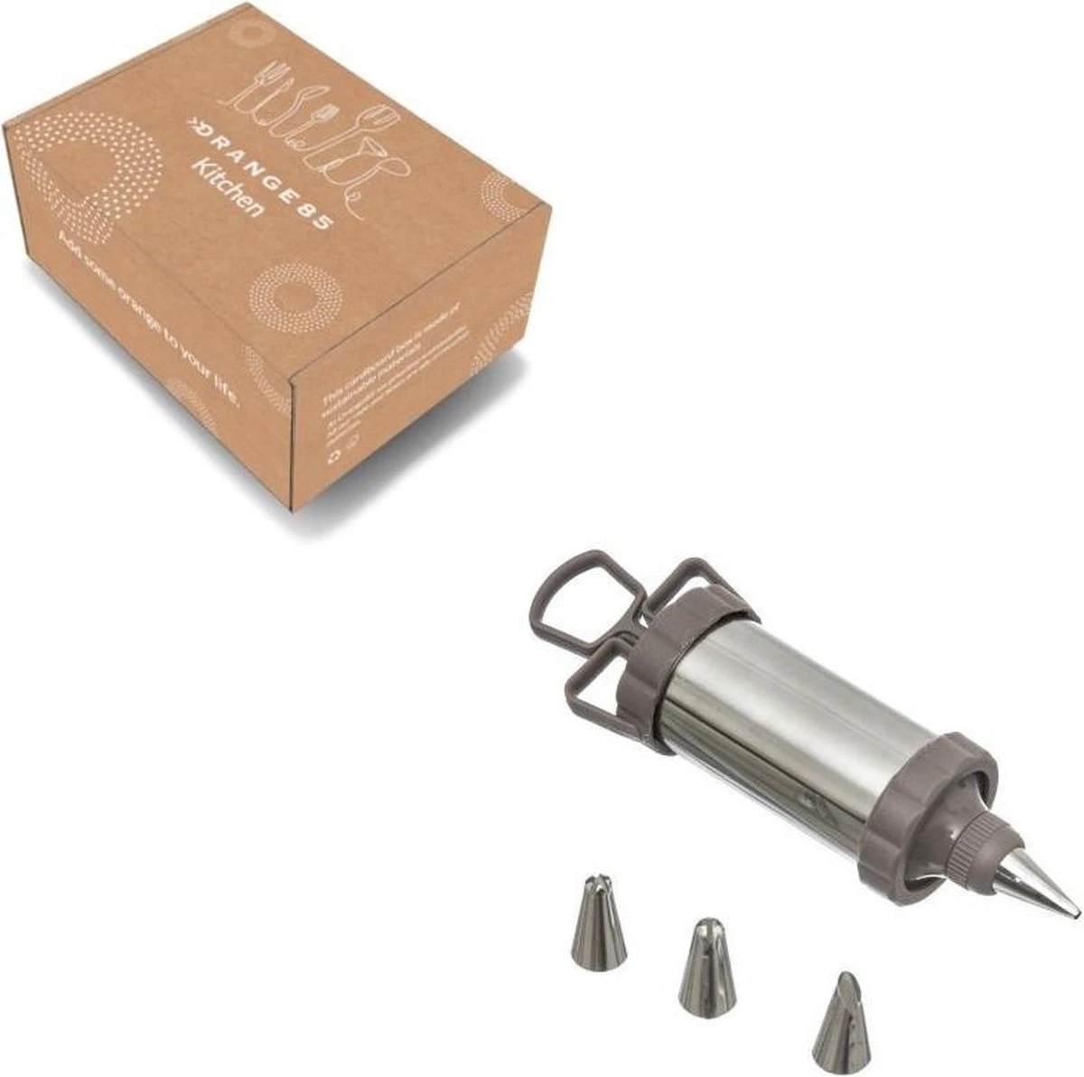 Met deze Orange85 RVS garneerspuit maakt u de mooiste decoraties op baksels. De vier spuitmonden zorgen ieder voor een andere vorm decoratie. Door het stevige materiaal is deze spuit makkelijk in gebruik met een goede houvast. Ook heeft deze spuit een ruime inhoud die moeiteloos bij te vullen is.