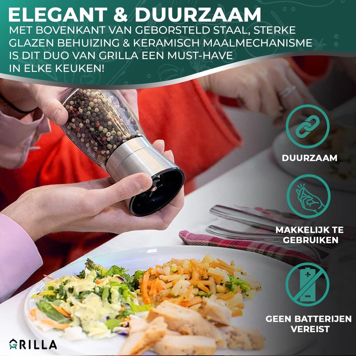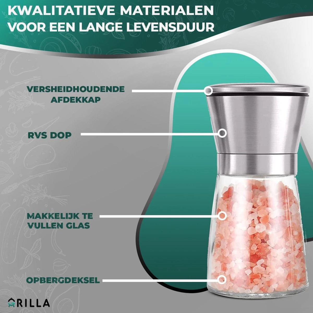 We kennen het allemaal wel, die veel te dure kleine zout- en pepermolentjes die je in de winkel kan kopen. Of die Ooo zo mooie kartonnen cilinders, die veel mensen hun kast hebben staan. Waarom staan al die zout- en peperstellen altijd in de kast denk je? Klopt, ze zijn gemaakt om weg te gooien, niet goed voor de natuur of je vrouw haar ogen, grapje… Maar zonder te dollen hebben wij de oplossing, de Zout- en Pepermolen set van Grilla. Je kan ze in een handomdraai bijvullen en uitgerust met roestvrij-staal en glas van de hoogste kwaliteit, zijn ze niet alleen goed voor de natuur, je kan ze ook eens op het aanrecht of tafel laten staan!