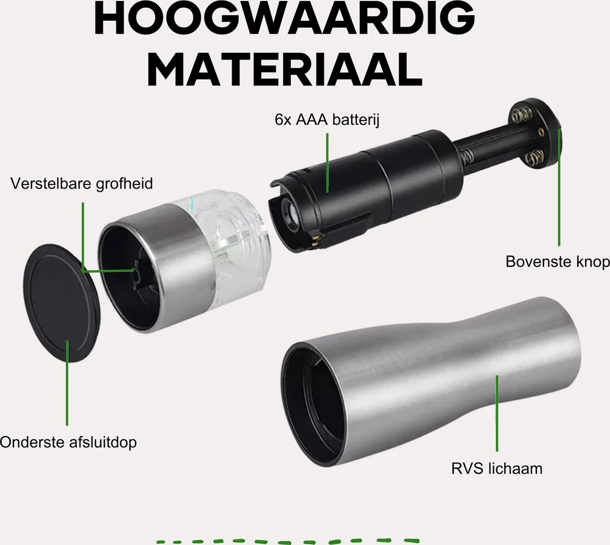 Proffesionele Butles kwaliteit: De pepermolen is zo geconstrueerd dat hij zeer lang mee gaat. De keramische molen is krachtig. Dit zorgt ervoor dat de molen ook de grote korrels Himalaya zout kan malen en dat de motor zeer lang mee gaat.