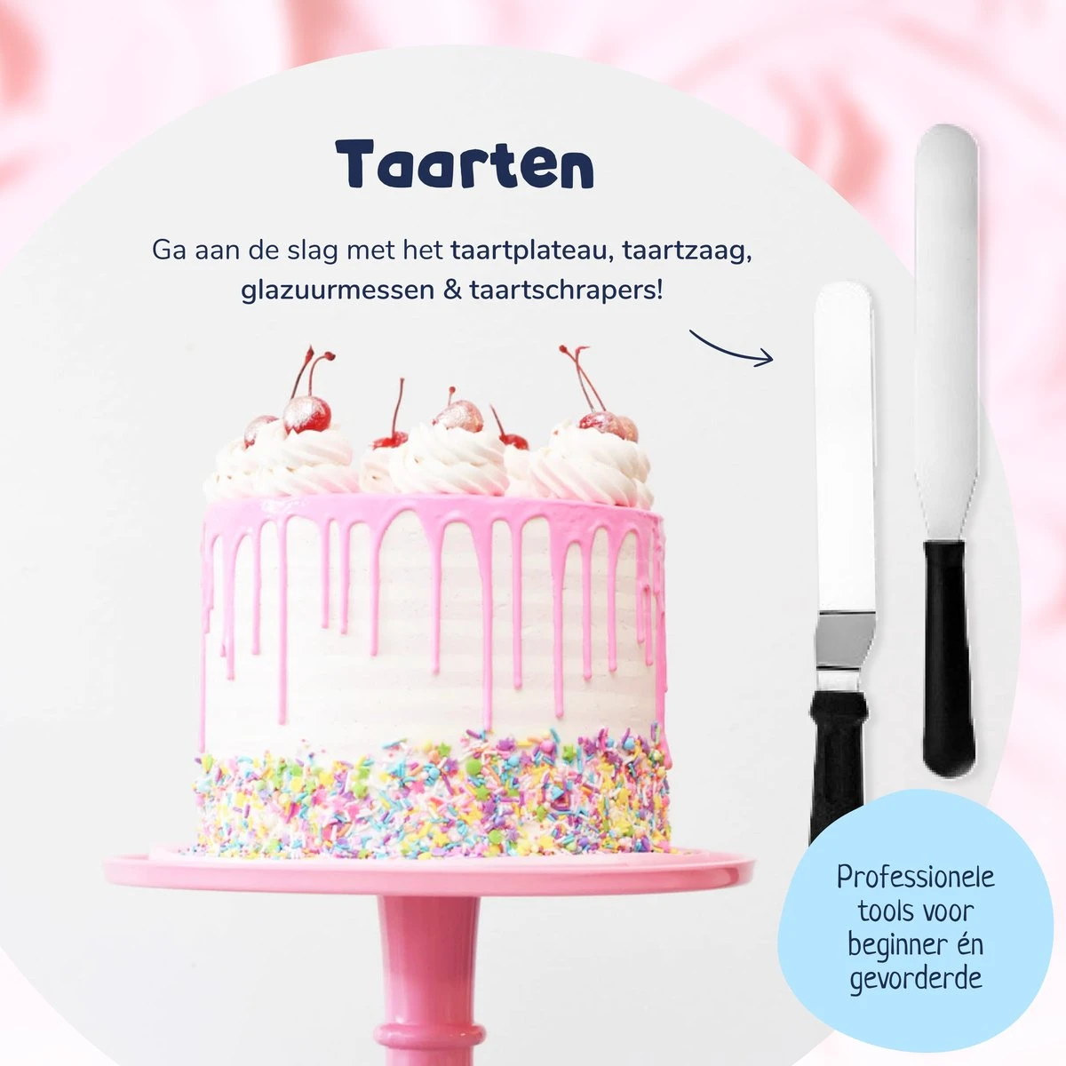 Bak en versier taarten met het draaibare taartplateau, de taartzaag & glazuurmessen, of creëer ongelimiteerd cupcakes met de herbruikbare cupcake vormpjes en spuitzakken!