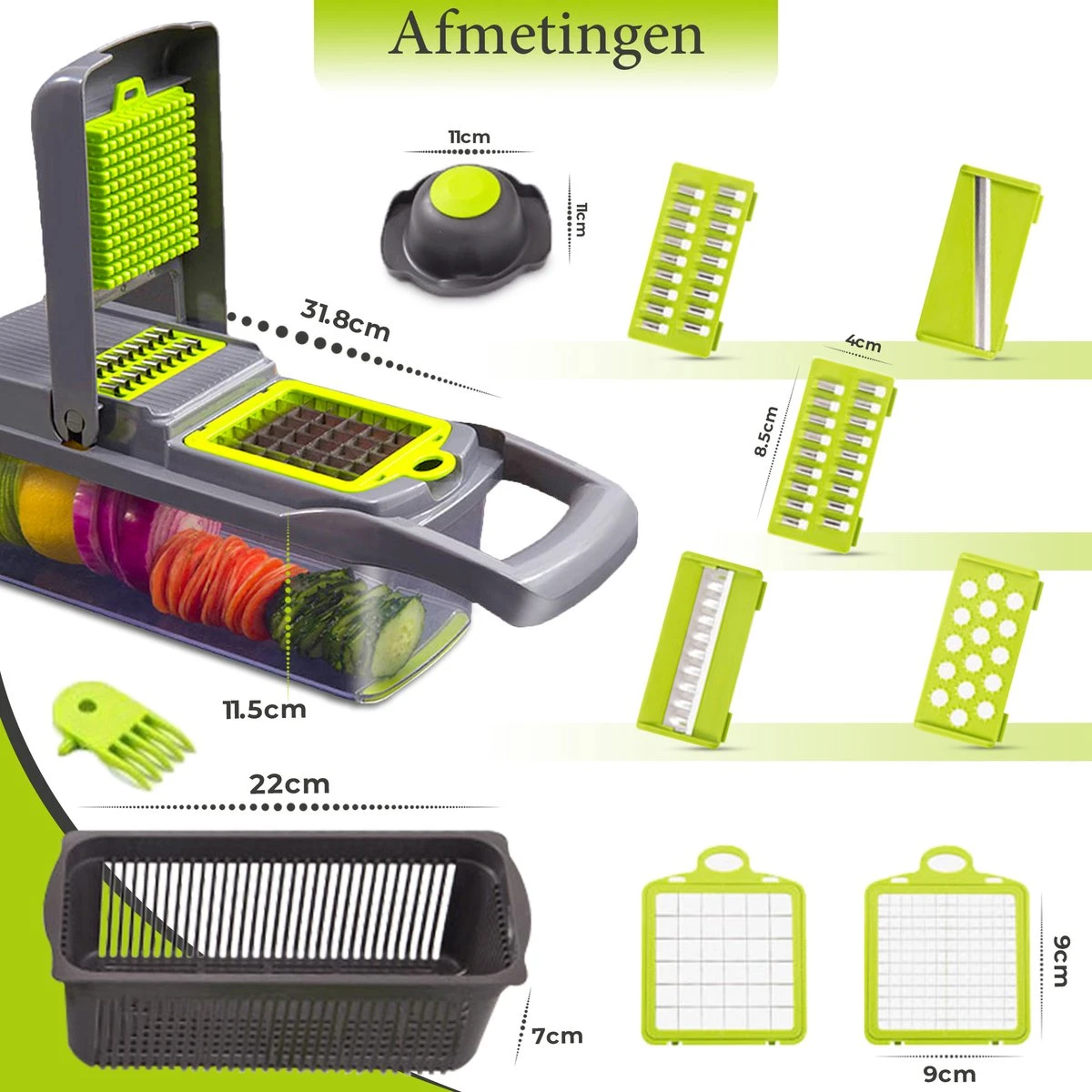 Deze Mandoline is een must-have in iedere keuken! Met deze multifunctionele groentesnijder snijdt je al je groente of fruit in een snelle en gemakkelijke manier. Deze 12-delige set is gemakkelijk op te bergen en schoon te maken. Door de scherpe RVS messen snijdt je zonder enige moeite stukjes groeten – fruit. Daarbij heb je nog de keuze hoe groot / hoe klein je de stukjes wilt hebben. Als wat je snijdt komt netjes in de opvangbak terecht. De set is voorzien van een bakje, die er gemakkelijk af te halen is. Dit bespaar enorm veelt tijd. Ook is er geen kans meer dat je je per ongelijk in je vingers snijdt.